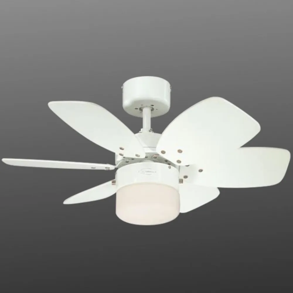 Også i et lille lokale bør der om sommeren såvel som om vinteren herske behageligt tempererede luftforhold. Med Flora Royale er det ikke noget problem: Loftventilatoren med seks vinger sørger for en adækvat luftcirkulation, som om vinteren også medfører en besparelse på varmeudgifterne. Den integrerede opalglaslampe afgiver derudover også den nødvendige oplysning af rummet. Flora Royale kan yderligere udstyres med en fjernbetjening (kan bestilles under tilbehør). En forlængerstang er inklusiv.