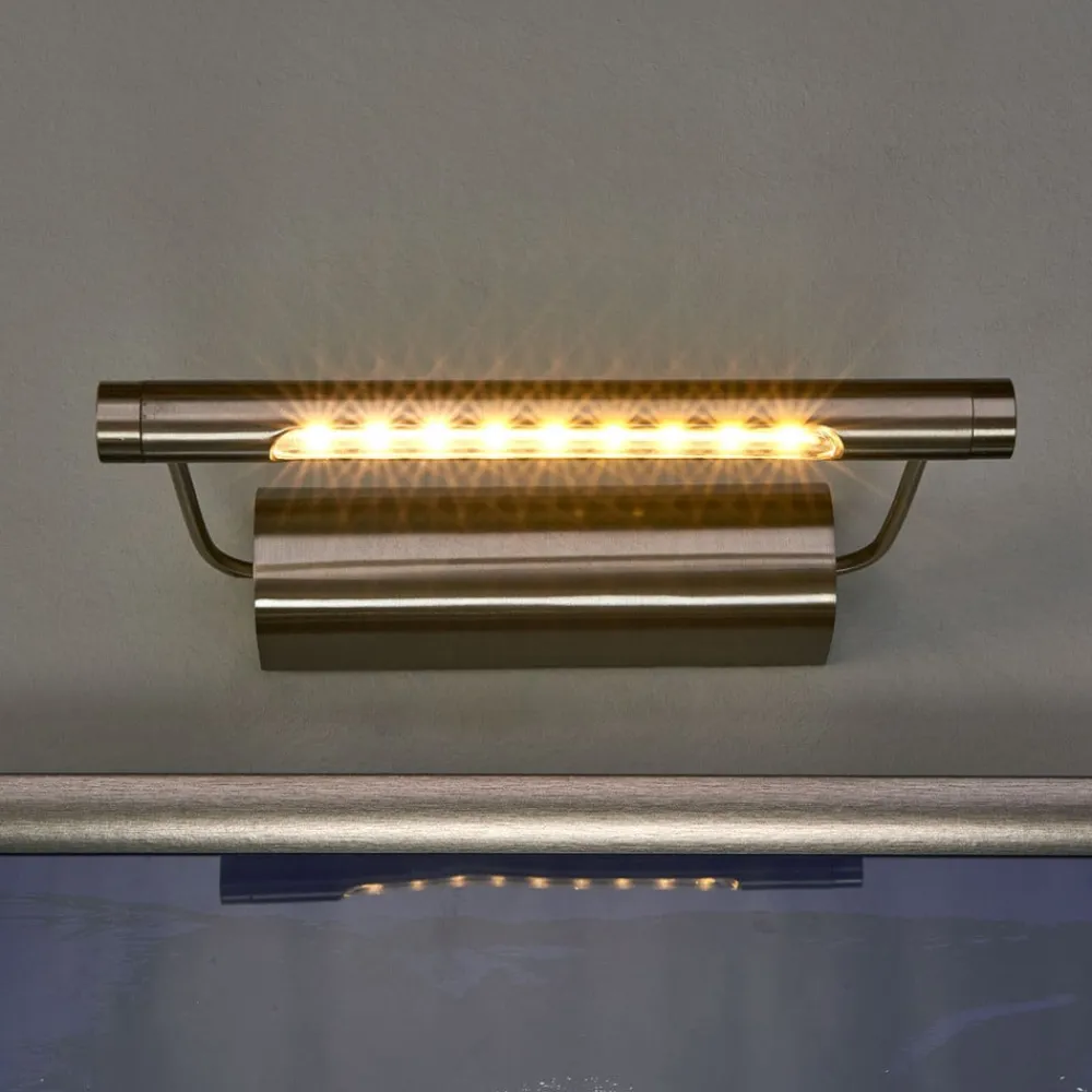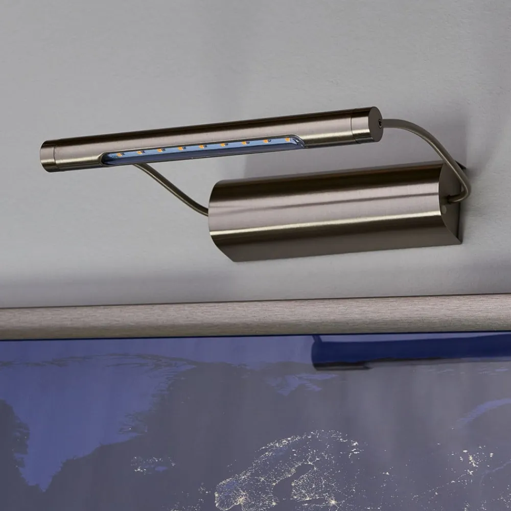 Tommy scorer point med to særlige kendetegn: For det første råder gallerilampen over energibesparende, varmhvide LED’er, og for det andet kræves ingen strømtilslutning i væggen til belysning af de smukke malerier, for lampen forsynes med den påkrævede strøm af tre AA-batterier (medfølger ikke). Kabinettet består af børstet rustfrit stål og kommer til at fuldende de belyste genstande på en yderst elegant måde. På siden af lampen findes en tænd-/sluk kontakt. Sidestængerne på lampen er faste og kan ikke hældes eller justeres.
