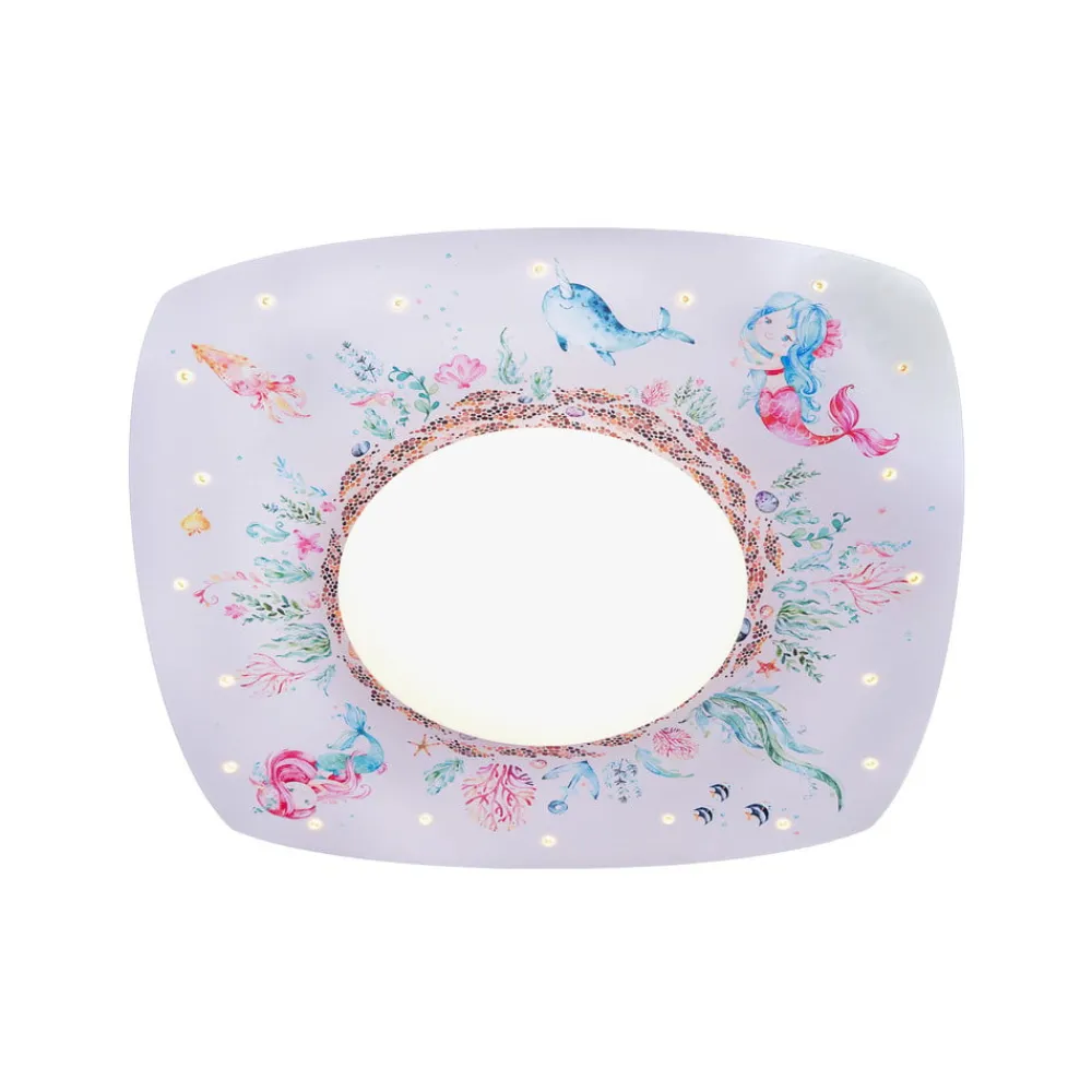 Havfrue loftlampe i et fantasifuldt design Denne loftlampe er specielt designet til børneværelser og bringer legende elegance til rummet med sit farverige design. Med dette belysningselement bliver børneværelset et sted, hvor fascinationen af lys afspejles i alle detaljer. Denne lampe kan tændes separat, så natlampen kan tændes hver for sig. Det varmhvide hovedlys er placeret i midten. De 40 LED’er i kanten af lyset kan tændes separat som natlampe. Det er nemt at skifte mellem de to belysningsmuligheder og slå alle lyskilder sammen ved hjælp af vægkontakten – Natlysfunktion med 40 lm