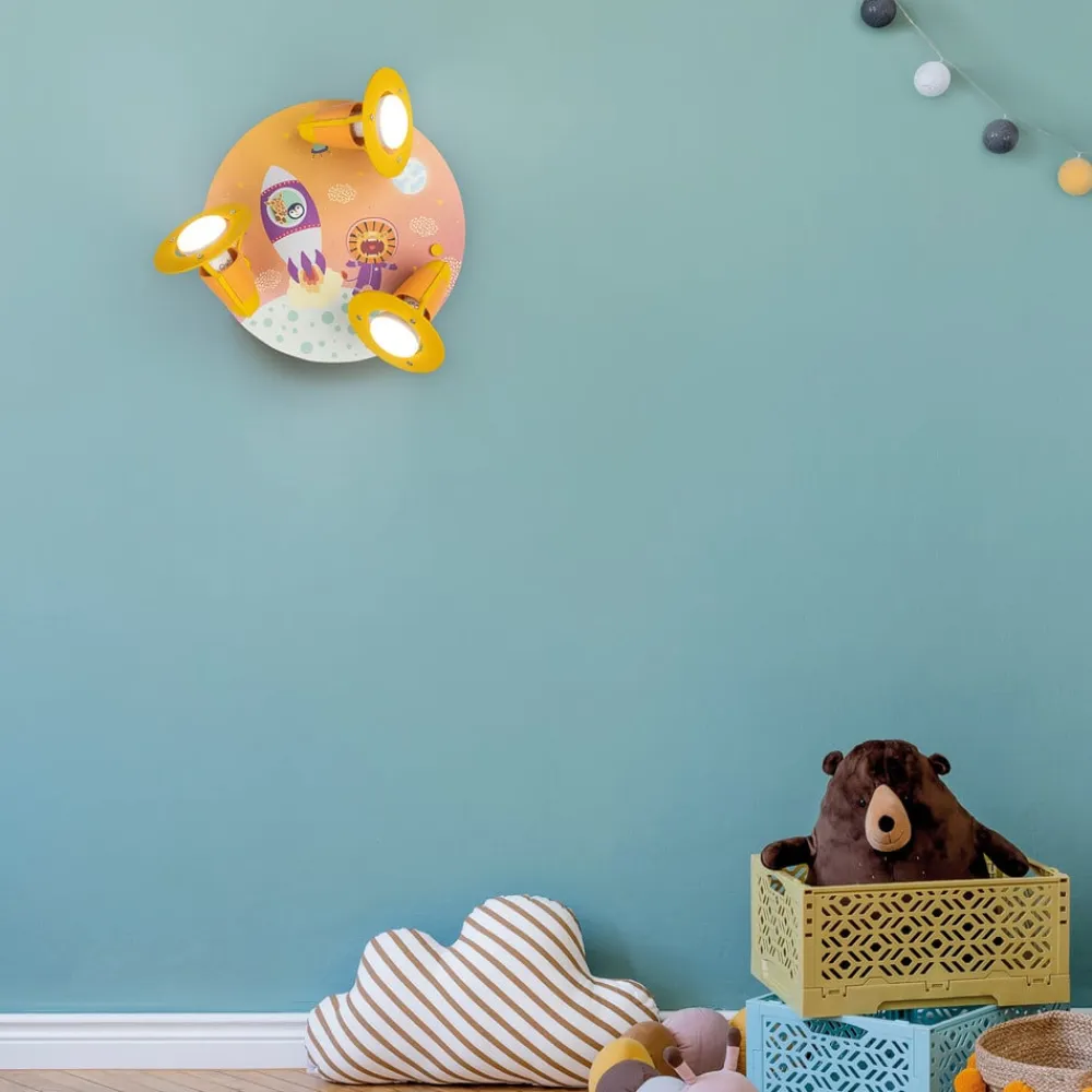 Loftslampe til børneværelset Escape med tre bevægelige spots Den fantasifuldt designede loftslampe Escape har et loftspanel i træ med et flot børnevenligt motiv. Giraffen og pingvinen sidder i raketten, og den modige løve går rundt på en planet i sin rumdragt. Hvem vil ikke gerne være med på turen og opleve store eventyr? Selve loftslampen er udstyret med tre bevægelige spotlights, som oplyser hvert hjørne af rummet og dermed giver tilstrækkelig grundbelysning på børneværelset.