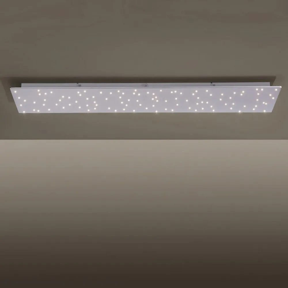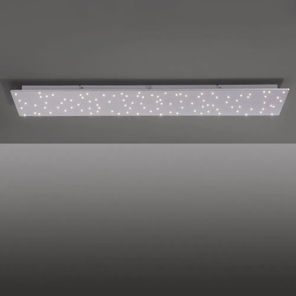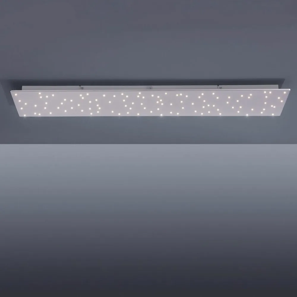 Rektangulær, stor LED-loftslampe Sparkle med skiftende lysfarve Denne rektangulære, meget flade LED-loftslampe Sparkle giver en generøs og stemningsfuld belysning i rummet. Gennemsigtige prikker er indarbejdet i den stålfarvede metaloverflade. Bag dem sidder LED-modulet, hvis lys kan slippe ud gennem prikkerne og skabe et look, der minder om en stjernehimmel. Det gør, at Sparkle ikke kun kan bruges til generel belysning, men også til accentbelysning. Den harmoniske rumatmosfære beriges af praktiske funktioner i lysdesignet. Loftslampen kan dæmpes i lysstyrke via den medfølgende fjernbetjening, og lysfarven kan også justeres fra varm hvid til universal hvid. Den kan således betjenes komfortabelt fra sofaen, eller du kan bruge den eksisterende vægkontakt til at tænde og slukke den.