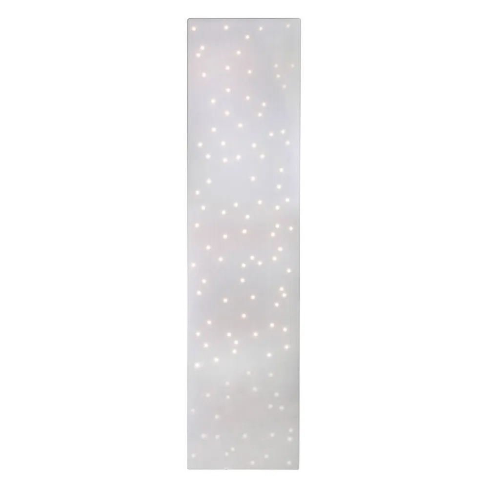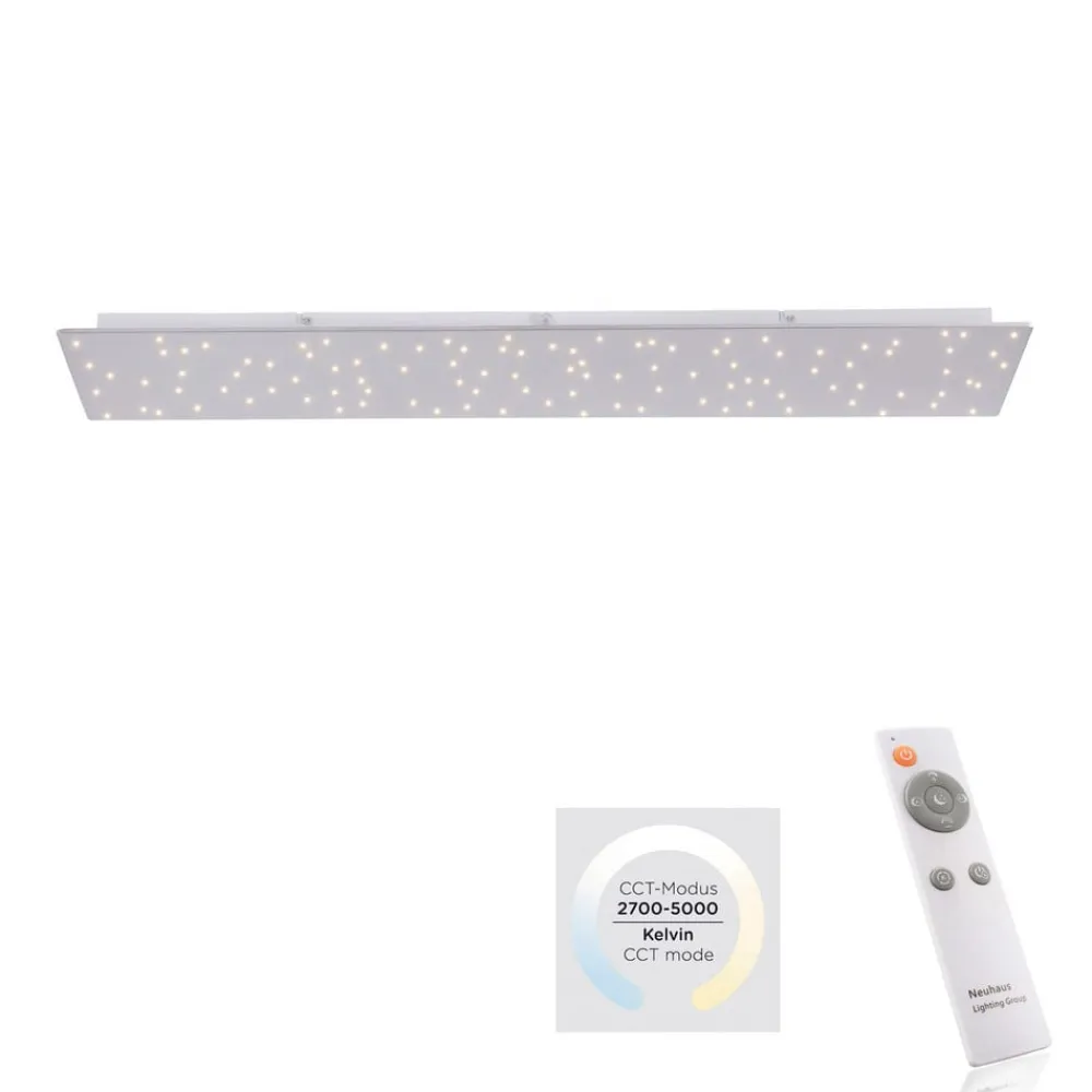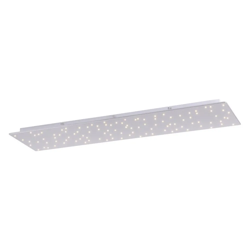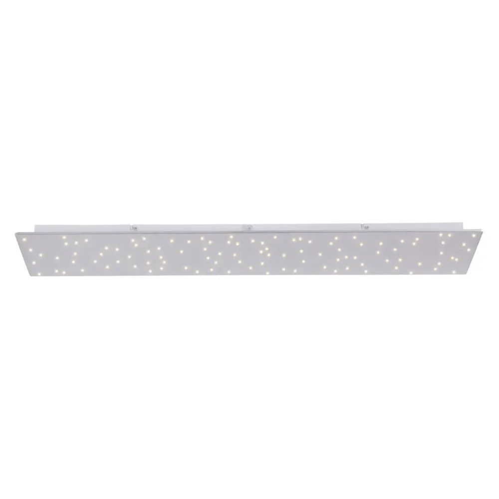 Rektangulær, stor LED-loftslampe Sparkle med skiftende lysfarve Denne rektangulære, meget flade LED-loftslampe Sparkle giver en generøs og stemningsfuld belysning i rummet. Gennemsigtige prikker er indarbejdet i den stålfarvede metaloverflade. Bag dem sidder LED-modulet, hvis lys kan slippe ud gennem prikkerne og skabe et look, der minder om en stjernehimmel. Det gør, at Sparkle ikke kun kan bruges til generel belysning, men også til accentbelysning. Den harmoniske rumatmosfære beriges af praktiske funktioner i lysdesignet. Loftslampen kan dæmpes i lysstyrke via den medfølgende fjernbetjening, og lysfarven kan også justeres fra varm hvid til universal hvid. Den kan således betjenes komfortabelt fra sofaen, eller du kan bruge den eksisterende vægkontakt til at tænde og slukke den.