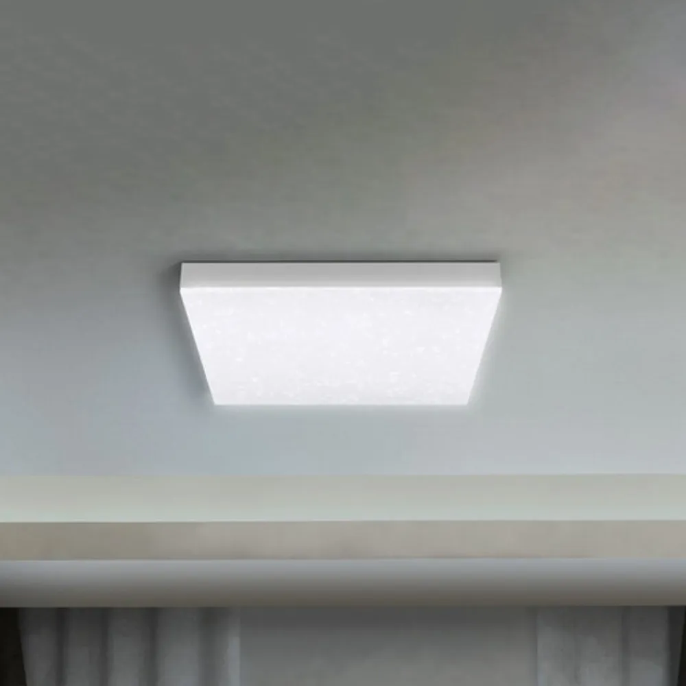 Planon FL Sparkle LED-panel med CCT-funktion og SMART WiFi-teknologiDet flade, kantede Planon FL Sparkle LED-loftarmatur kan styres smart takket være WiFi-teknologi, nemlig efter WLAN-forbindelse via tablet eller smartphone med LEDVANCE SMART WiFi-appen, der er gratis tilgængelig til Android- og iOS-enheder. Stemmestyring med Google Assistant eller Amazon Alexa er også mulig. Panelet har et rammeløst design og et plastikdæksel, der skaber en funklende stjernehimmel i rummet takket være glitrende effekt. Lysstyrken og farvetemperaturen kan justeres, så den passer til situationen. LED-panelet er hurtigt og nemt at installere, det komplette installationsmateriale medfølger.- Dæmpbar- Lysfarve justerbar: varm hvid (3.000 K) til dagslys (6.500 K)- Smart integration via WLAN- Styrbar via LEDVANCE SMART WiFi app- Stemmestyring via Google Assistant eller Amazon Alexa mulig
