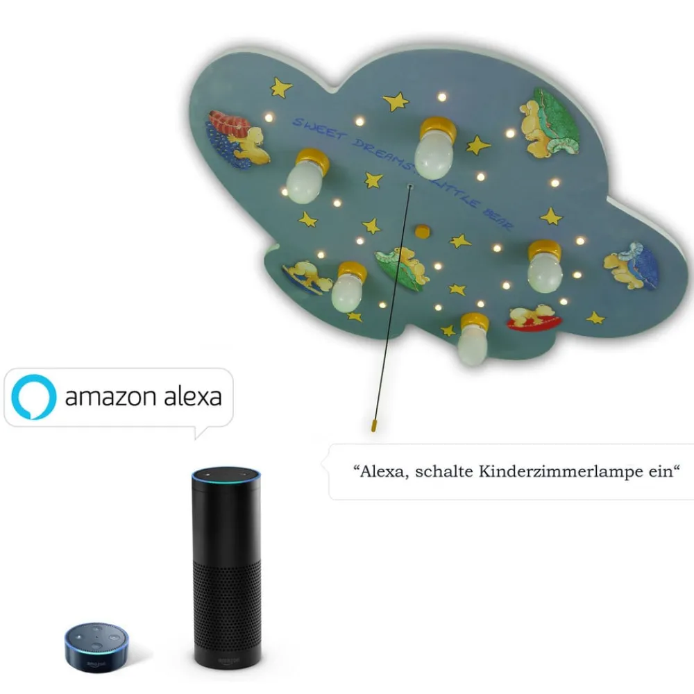 Bärchen loftlampe er et typisk lys til børneværelset, der imponerer med et børnevenligt motiv. Et stort antal stjerner og seks sovende bjørne er fordelt på den skyformede loftlampe . Lampens grundfarve er blå. De fem vigtigste lyskilder er arrangeret i en cirkel og tændes og slukkes af justerbar wiremekanisme på lampen. Derudover er der installeret 20 LED-lyspunkter på armaturet, som aktiveres / deaktiveres med vægkontakten. Når rumkontakten betjenes, genaktiveres det forrige lysscenarie. Hvis E14-lamperne blev tændt, gendannes fuld belysning. Hvis de primære lyskilder er slukket, aktiveres kun funktionen for udsættelse af lys, når lyset tændes via vægkontakten, som giver en orienteringshjælp i mørke.