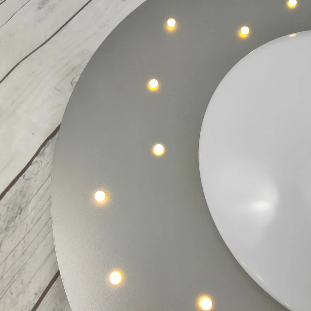 Med stjernehimmel: Starlight loftslampe med trækkontakt Starlight loftslampen er velegnet både som generel belysning i børneværelset og i sin funktion som stjernehimmel. 20 individuelle LED’er indlejret i loftspladen funkler som små stjerner. Hovedlyskilden er en E27-fatning (pære medfølger ikke, se tilbehør). Den kan deaktiveres med en trækkontakt, hvis du kun ønsker at lade stjernehimlen skinne. Den består af MDF-træ og plast og er lakeret i én farve.