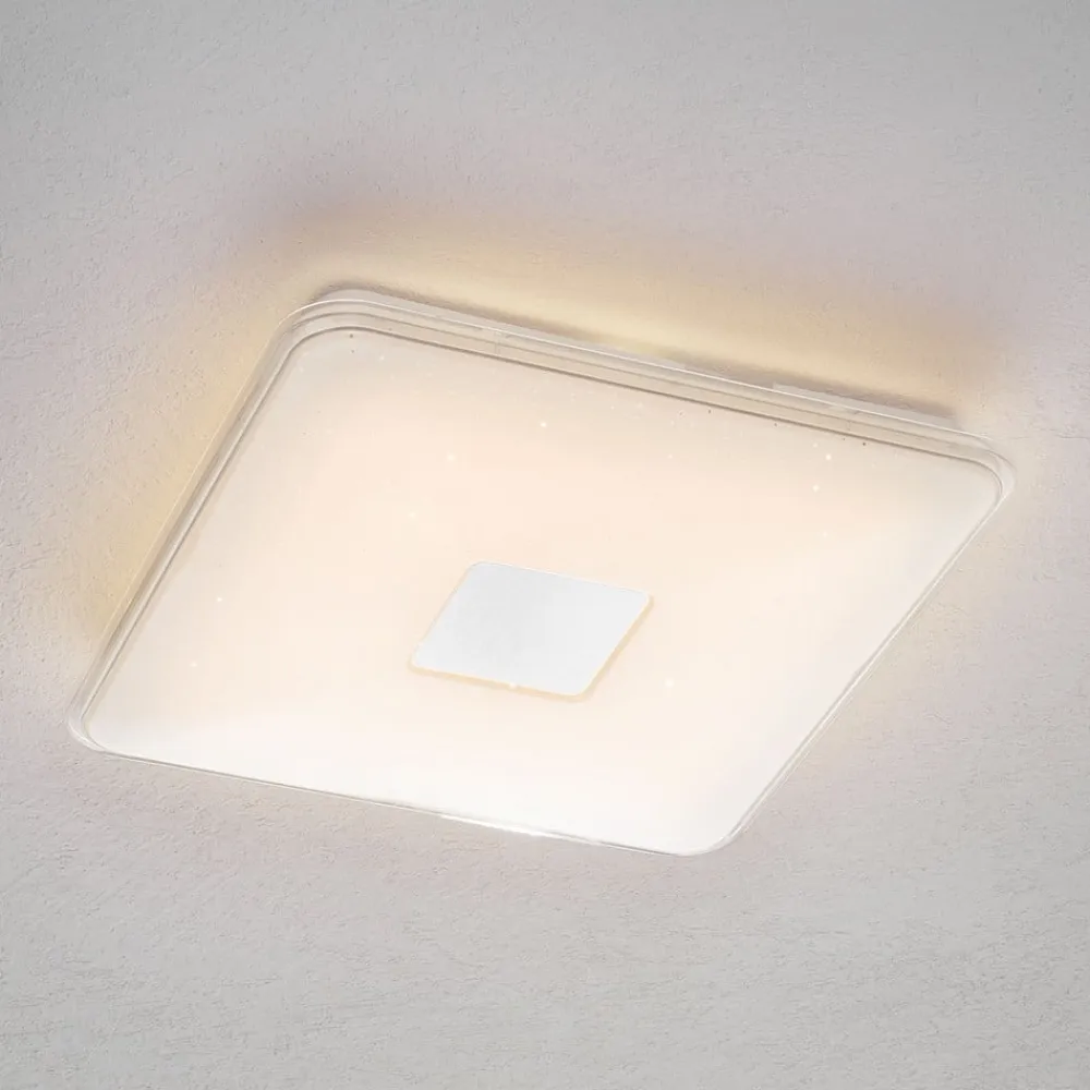 LED loftslampen Samurai holder enkelte funktioner klar, som gør livet dejligere i brugerens hjem. Den medfølgende fjernbetjening gør det muligt at styre alle funktioner efter behov. Således kan man regulere lysstyrken med den eller også vælge lysfarve blandt varmhvid, universalhvid og dagslys. Det giver en lang række forskellige atmosfærer og gør lampen alsidigt anvendelig. Desuden har den en natlampefunktion. Om natten funkler den fiktive stjernehimmel i loftet og indbyder til at drømme. Loftslampens udseende er præget af en kvadratisk form med afrundede hjørner og fuldendes af et lille kvadrat i midten af lampens plastskærm. Samurais funktioner er lige så omfattende som anvendelsesmulighederne.