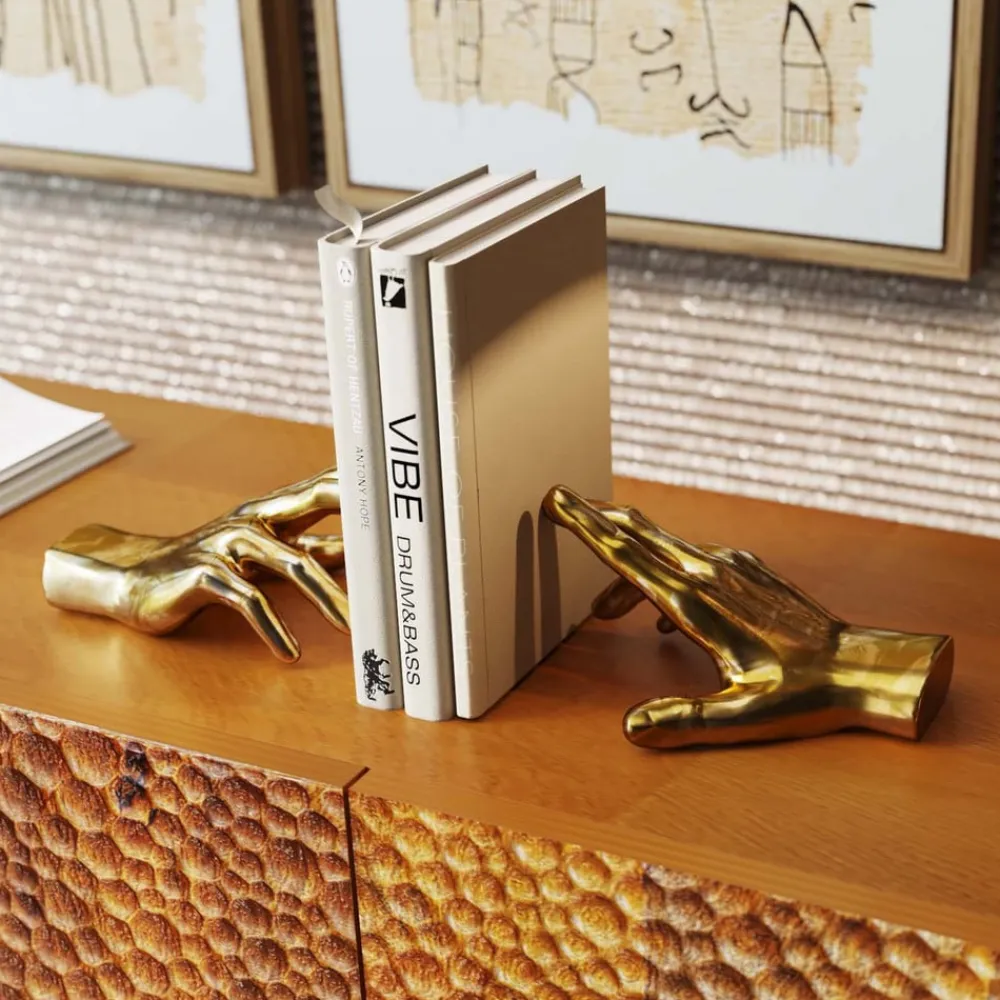 Holding Fingers-bogstøtte af folieret polyresin i et sæt med 2 Denne todelte Holding Fingers-bogstøtte kommer bedst til sin ret i sin gyldne farve. Bøger og andet bliver vist frem på en stilfuld måde. Bogstøtterne er især nyttige på hylder uden lukkede sidepaneler, men hænderne kan også bruges til elegant at organisere bøger på et skrivebord eller i en vindueskarm.