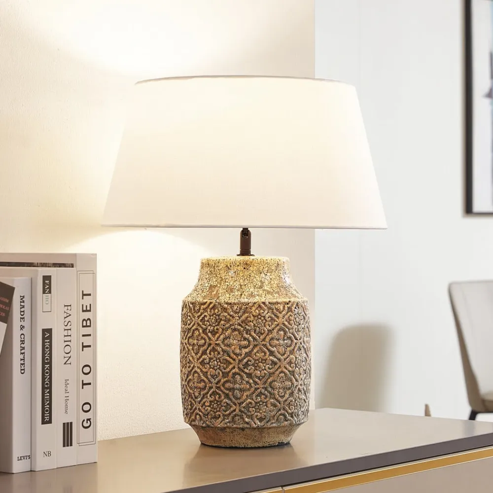 Aelith bordlampe med keramikfod og tekstilskærm Denne bordlampe er en smagfuld tilføjelse til dit belysningskoncept. Bordlampen kan nemt tændes og slukkes ved hjælp af en lyskontakt. Den præsenterer sig i en smuk stil og integreres smukt i alle boligområder. Denne lampe kombinerer alle de kvaliteter og højdepunkter, der kendetegner Lindby-mærket. Lampen er grå i farven. Den kan monteres med lyskilder med E27-sokkel. Den smukke lampe har et flot design og skaber en hyggelig stemning i ethvert rum. Bordlampen er en stilfuld måde at lyse dit rum op på, hvilket gør den til et fremragende valg til din indretning. Lad dig fortrylle af denne bordlampe.