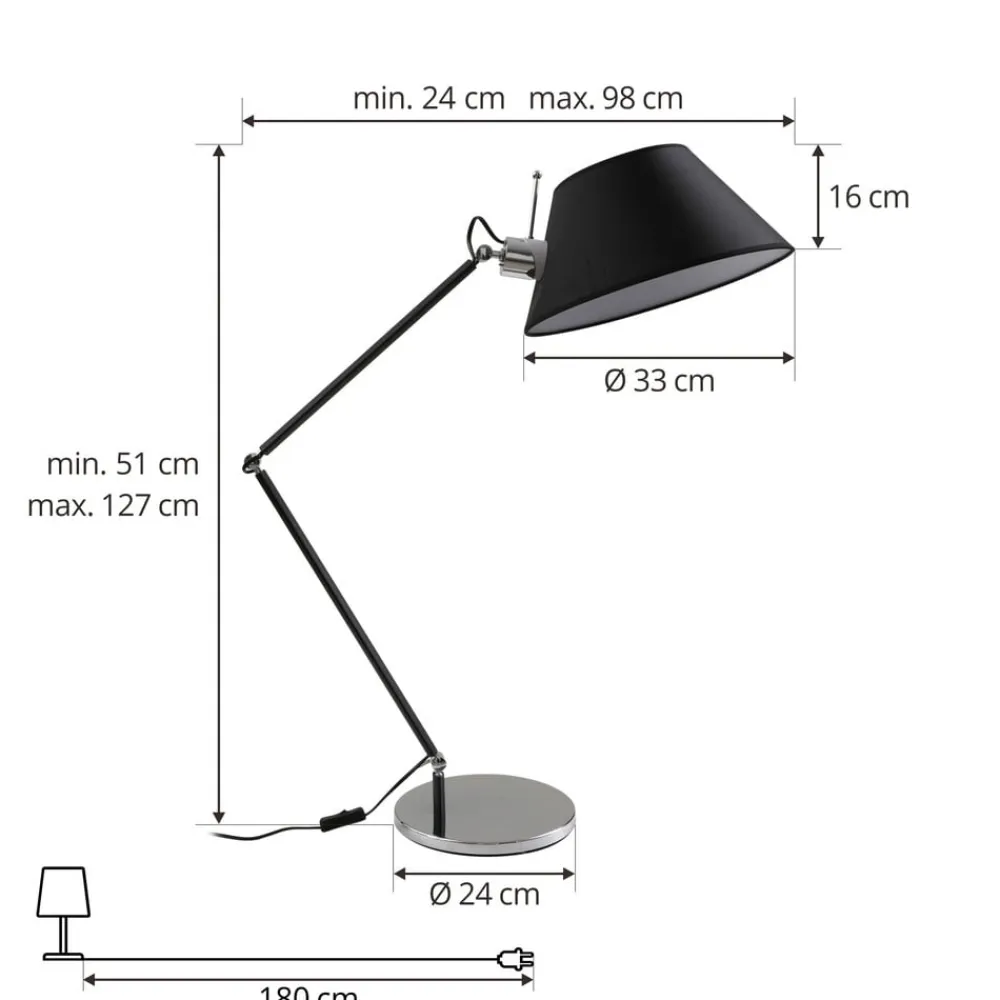 Generøs Dansari-bordlampe, justerbar i højde og udspring Dansari-bordlampen i en elegant farvekombination af sort og kromfarvede elementer er et ægte blikfang i enhver stue. Med sin justerbare højde og fremspring takket være leddene kan den tilpasses perfekt til individuelle behov og giver dermed en behagelig belysning. Det enkle design i kombination med den sofistikerede kromfinish giver lampen en tidløs elegance. Uanset om man læser, arbejder eller slapper af – Dansari-gulvlampen fra Lucande skaber en hyggelig atmosfære og sætter en behagelig stemning i rummet. Der er en kontakt på kablet for nem betjening.