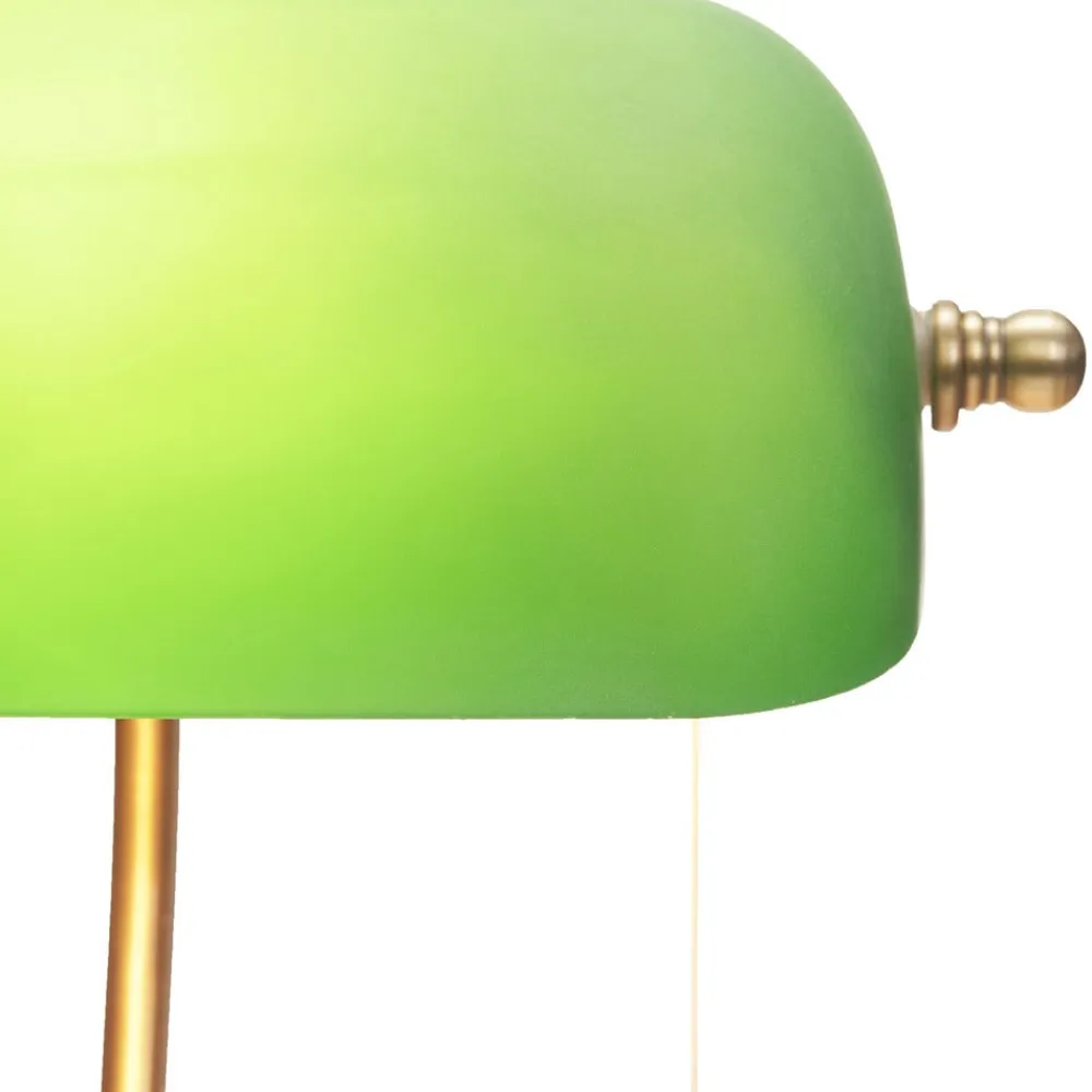 Milenka skrivebordslampe i bankerstil Milenka kan beskrives som en klassisk banklampe, da den minder om bordlamperne fra 1920’erne og 1930’erne, som stammer fra USA, hvor de ikke kun blev brugt på biblioteker, men også i advokatfirmaer, kontorer og banker. Med deres for det meste messingfarvede stel og ofte grønne skærme har disse lamper opnået kultstatus den dag i dag og har fundet beundrere over hele verden. Den aflange glasskærm, som er grøn på ydersiden og hvid på indersiden, sikrer, at lyset hovedsageligt sendes nedad, og at læsefladen er godt oplyst, men at det omgivende lys ikke virker for skarpt. For hurtig og bekvem tænding og slukning er der en trækontakt på skrivebordslampen, som kan betjenes med en enkelt bevægelse og ser meget stilfuld ud.