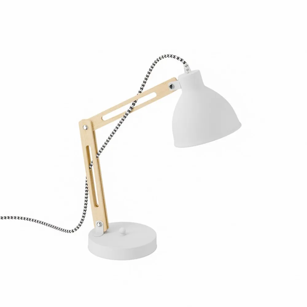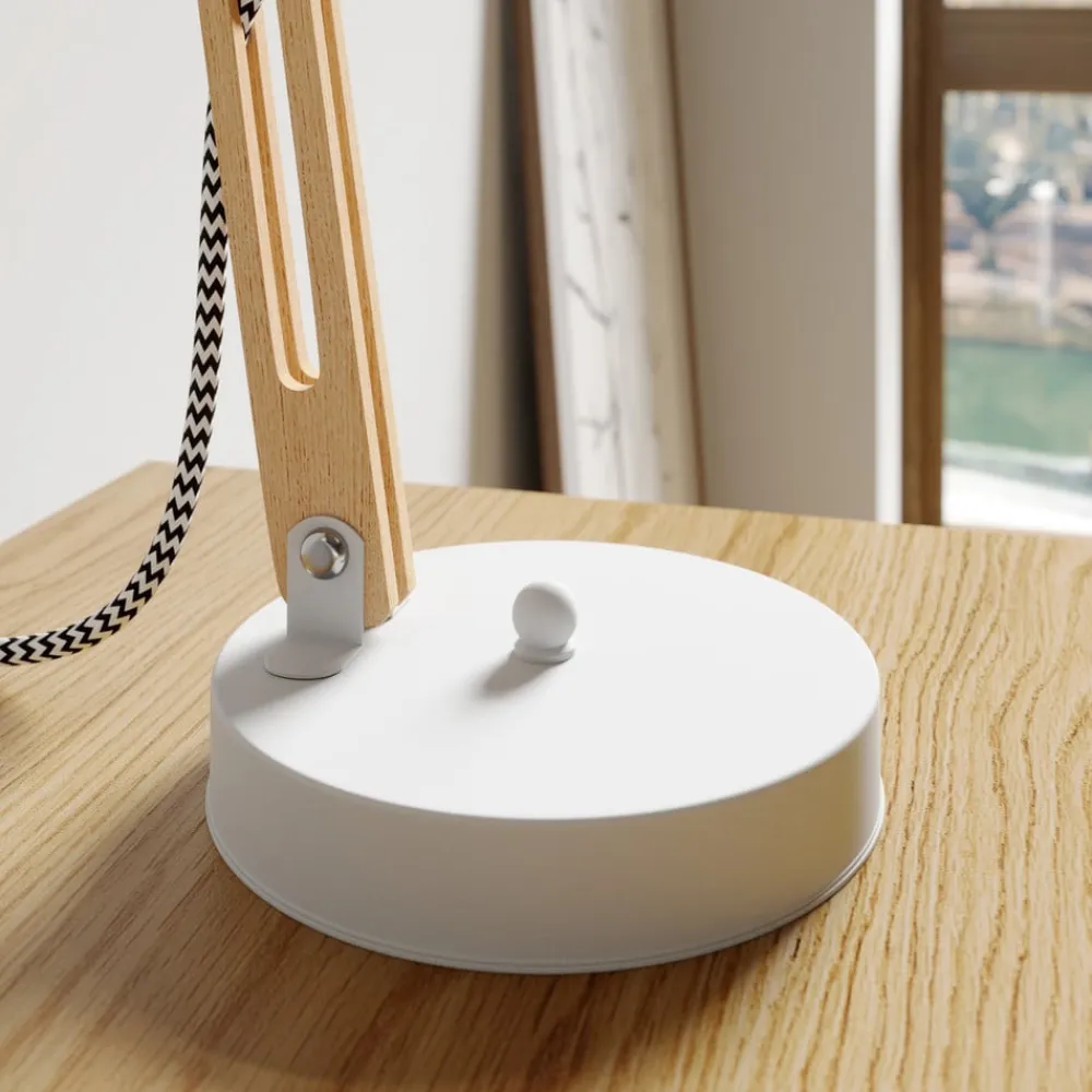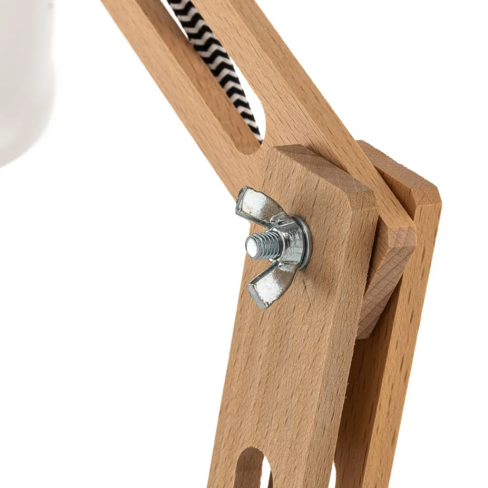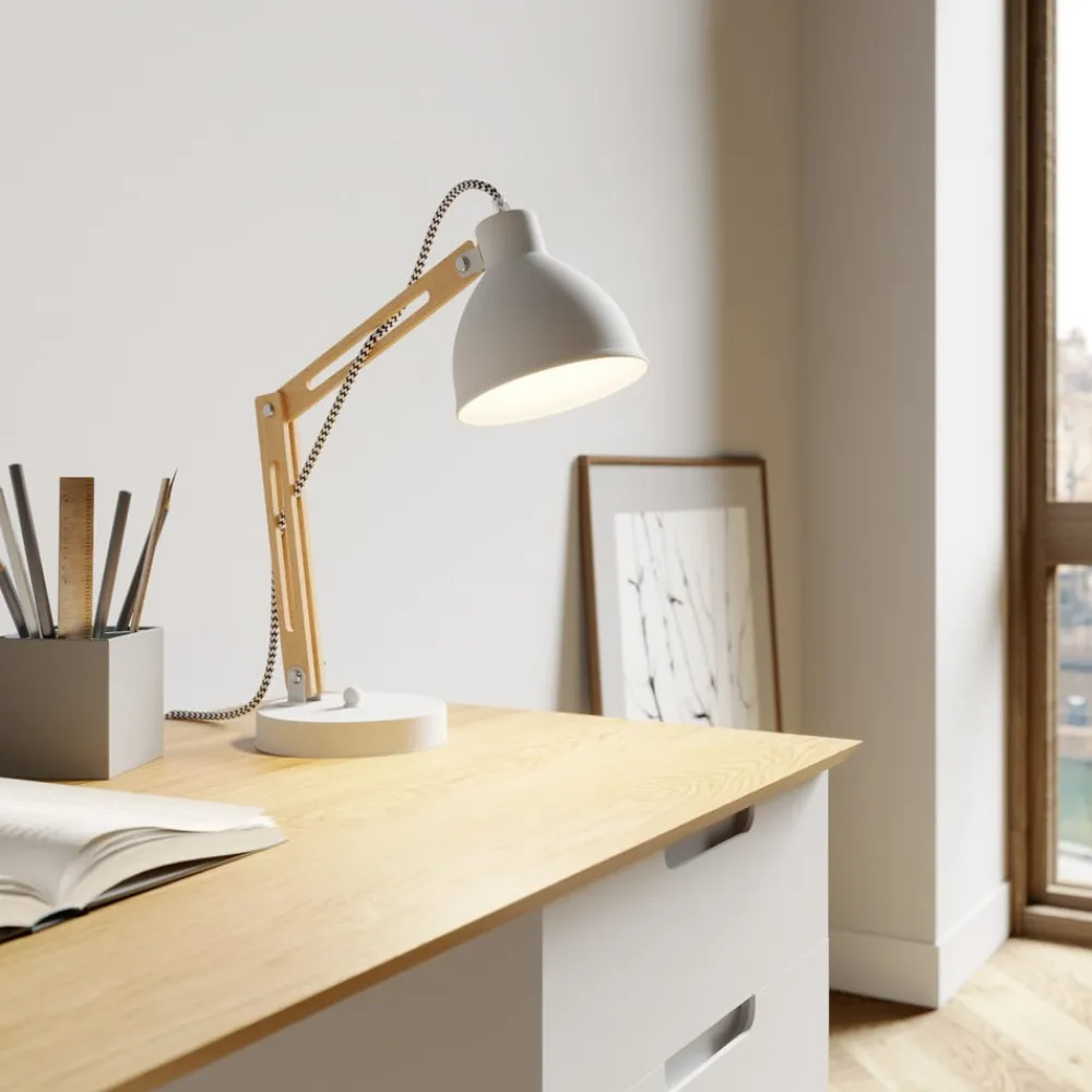 Bordlampen Skansen forener industrielt design med funktionel elegance og er et highlight i ethvert rum. Den er fremstillet af en harmonisk kombination af træ og metal og stråler i en lys hvid farve, der passer perfekt ind i stuen, arbejdsværelset eller spisestuen. Den justerbare konstruktion gør det muligt at tilpasse lyskilden fleksibelt, så den passer til forskellige stemninger og behov.