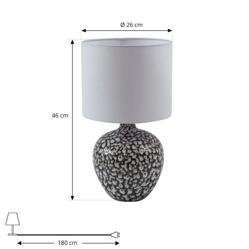Dekorativ Thalassia-bordlampe med mønstret keramikfod Thalassia-bordlampen består af en keramikfod og en hørskærm. Kombinationen af materialer og farver skaber en særlig harmonisk effekt og gør lampen til et smukt blikfang, selv når den er slukket. Den lyse hørskærm sender et blændfrit, varmt lys ud i omgivelserne. Den mønstrede base skaber en dekorativ accent i opholdsrummet. Bordlampen tændes og slukkes ved hjælp af en kontakt på ledningen. Thalassia kan med fordel bruges som lyskilde i entréen eller stuen.