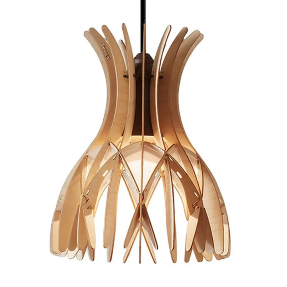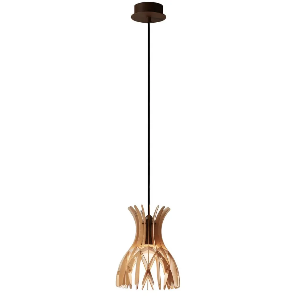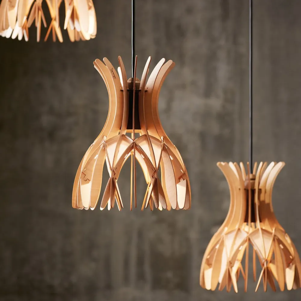 Domita pendellampe en varm træfarve i kombination med geometriske mønstre. Med sit farveskema skaber lampen en hyggelig atmosfære, og dens design understreger frem for alt moderne møbelstil. Skyggen er omhyggeligt håndlavet af træelementer i forskellige størrelser, så der skabes et interessant mønster. Så snart en passende lyskilde indsættes i det eksisterende GU10- fatning , fylder et atmosfærisk spil af lys og skygge miljøet. fatning og lampen er indbygget på en sådan måde, at de ikke er frit synlige, og det ser ud som om Domita lyser indefra.