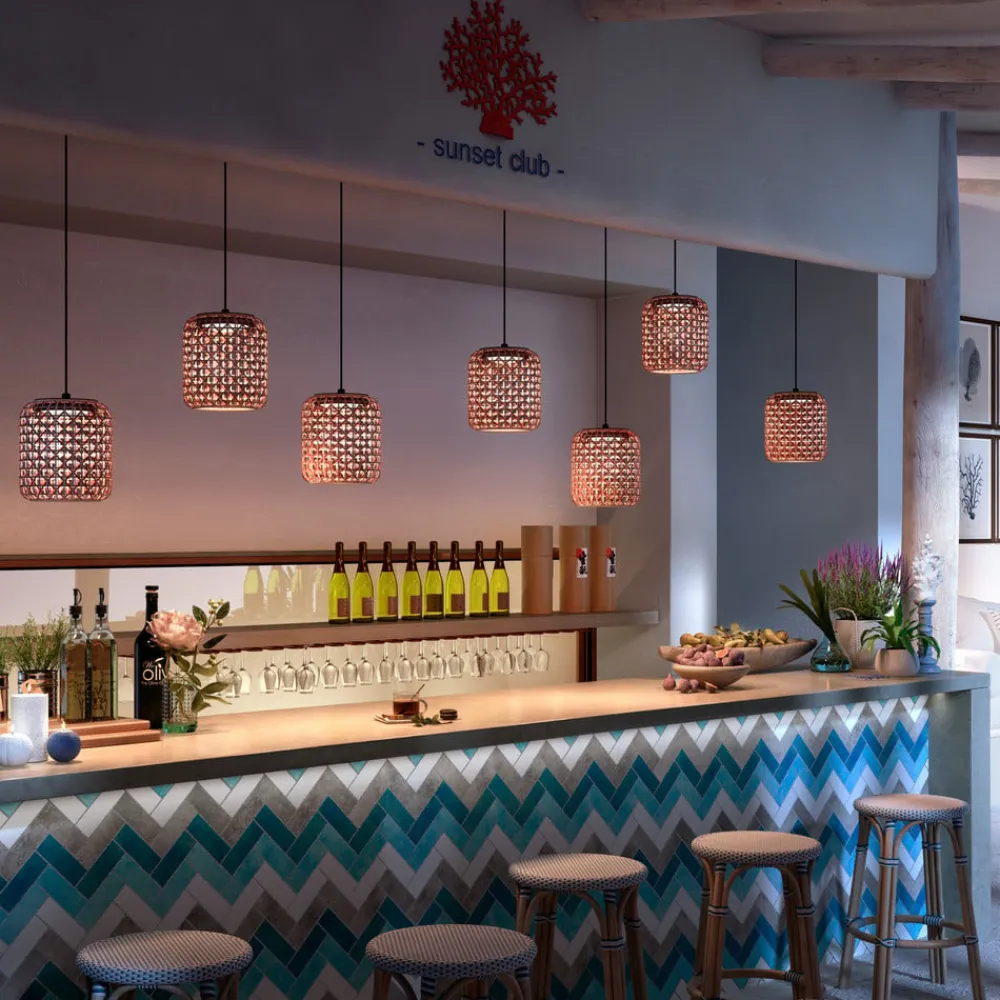 Designer udendørs pendel Nans A med vævet skærmDesignfirmaet Bover, der har base i Barcelona, legemliggør middelhavsstilen med sine Made in Spain-produkter. Pendellampen Nans er designet til udendørs brug, men kan også bruges indendørs. Den cylindriske skærm er vævet af en syntetisk fiber, hvor forskellige farvede tråde er vævet ind i hinanden. Pendlen er triac-dæmpbar, lysdæmperen er ikke inkluderet.