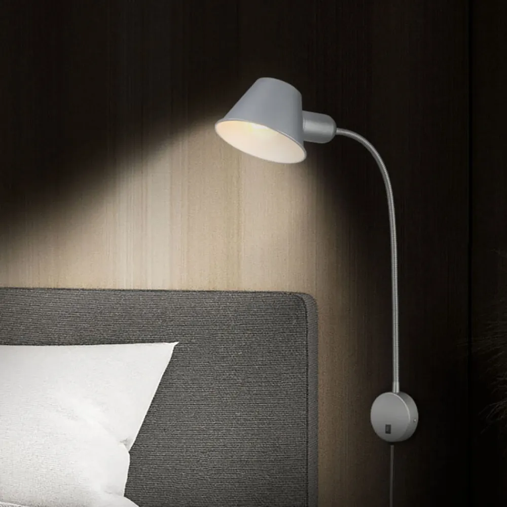 Brello væglampe med fleksibel arm, afbryder og rundt vægbeslag Brello væglampen er en fleksibel lyskilde, især som læselampe ved siden af sengen eller sofaen. Den fleksible arm gør det muligt at rette lyset efter behov. Skærmen, der er formet som en keglestub, indeholder en E27-fatning (pære medfølger ikke) og monteres ved hjælp af et rundt vægbeslag, som også rummer tænd/sluk-kontakten. Udstyret med stikprop.