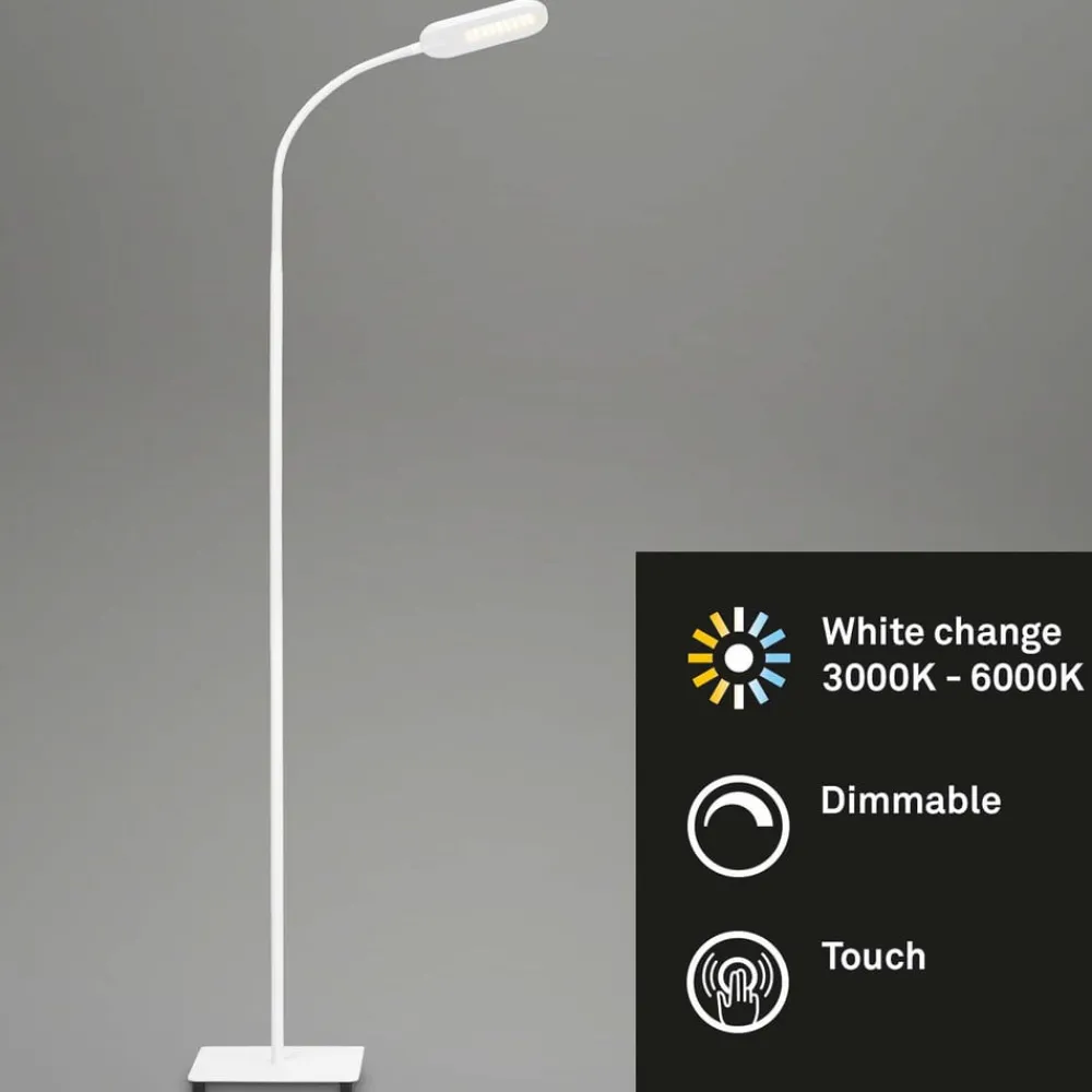 Med denne LED-gulvlampe kan du justere lysstyrken i fire trin efter dine egne præferencer. Ved at trykke flere gange på tænd/sluk-knappen på armaturets skærm kan lysstyrken dæmpes i fire trin: 100 %, 75 %, 50 % og 25 %. Desuden er gulvlampen udstyret med et CCT-lysstyringssystem, der gør det muligt at justere farvetemperaturen i tre niveauer – varm hvid, universalhvid og dagslys. Det hvide metalhus har et tidløst design, som gør det muligt at integrere armaturet i næsten alle rum – i hjemmekontoret, i stuen eller på virksomhedens kontor. Denne LED-gulvlampe tilbyder mange anvendelsesmuligheder og takket være de forskellige funktioner en bred vifte af belysning.