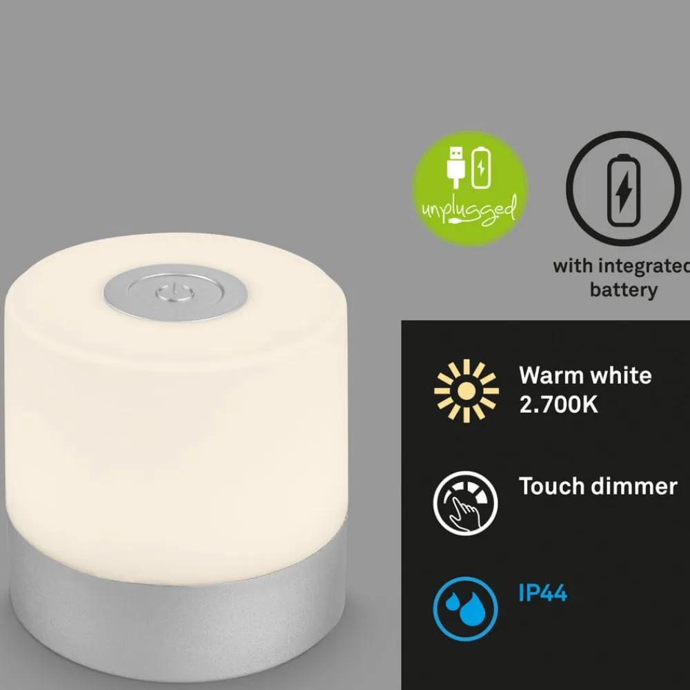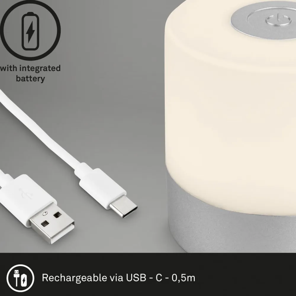Kompakt LED-bordlampe 74610 med genopladeligt batteri og touch-dæmper, varm hvid (2.700 K)Den lille LED-bordlampe i cylindrisk form er udstyret med et genopladeligt batteri og kan derfor placeres fleksibelt overalt indendørs og, takket være beskyttelsesklasse IP44, også på terrassen eller i haven som en stemningsfuld lyskilde uden forstyrrende kabel. Batteriet kan oplades via det medfølgende USB-ladekabel (uden netadapter). Lampen tændes og slukkes via kontakten, der er integreret i lampens fod. Lyset kan skiftes til tre lysstyrkeniveauer (100 %, 50 % eller 20 % lysstyrke) via berøringskontakten på toppen af lampen ved gentagne berøringer af sensoren.