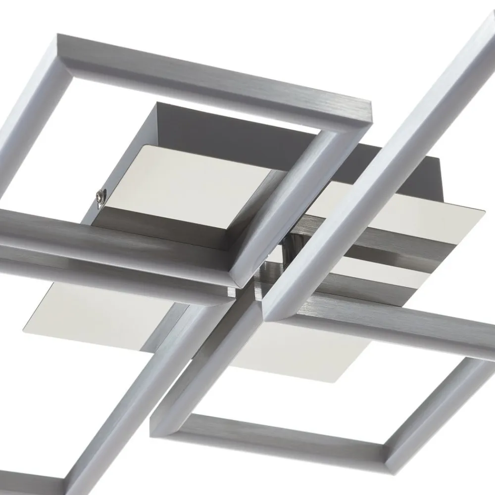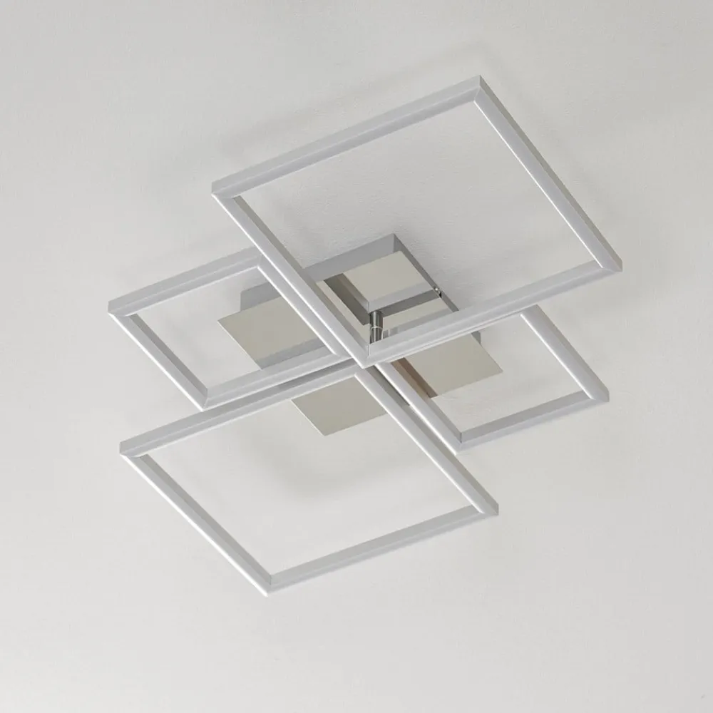 Vinklet Frame LED-loftslampe i krom og sølv Den elegante Frame LED-loftslampe er ikke kun et godt belysningssystem, men også en visuel berigelse for ethvert boligområde. Lampens luftige design giver rummet et moderne og friskt præg. Armaturet består af rektangulære lyselementer i krom og sølv i forskellige størrelser, som monteres i loftet via et lige så rektangulært kabelcover. Rektanglerne kan drejes og fordeler lyset optimalt i rummet. Lysets intensitet kan også justeres efter behov ved hjælp af trinvis lysdæmper.
