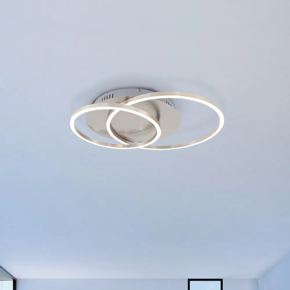 Frames LED-loftlampe består af to store ringe, der er forskudt oven på hinanden og er udstyret med lysdioder. Armaturet kan generere en høj lysstyrke, så større rum også kan finde den rigtige belysning. Om nødvendigt har du mulighed for at justere lysstyrken trinvis ved hjælp af vægkontakten. Med sit design er loftlampe velegnet til brug i moderne opholdsstuer.