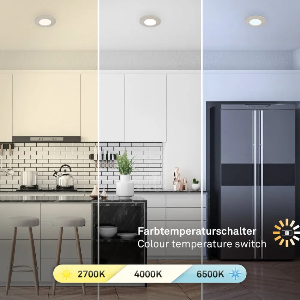 LED-indbygningsspot 7598 i sæt med 3 med justerbar lysfarve En særlig egenskab ved dette LED-indbygningsspot, som leveres i et fordelagtigt sæt med 3, er den justerbare lysfarve via en kontakt på bagsiden. Det gør det til et indbygningsspot, der kan bruges universelt i alle rum. – Justerbare lysfarver: Varm hvid (2.700 K), universal hvid (4.000 K) eller dagslys (6.500 K)