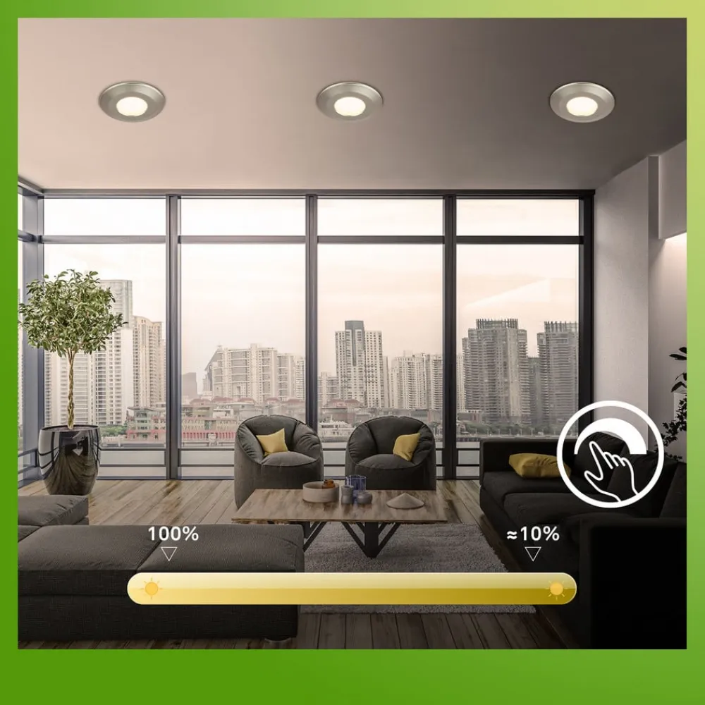 Fremstillet af genbrugsplast: dæmpbar Klira indbygningslampe i sæt med 3 stk. med justerbar lysfarve Oplev alsidigheden i indbygningslampen, som med sin CCT-funktion skaber stemningsfulde accenter i opholdsrum, især badeværelser. Den integrerede LED-lyskilde giver ikke kun en energieffektiv belysningsløsning, men også mulighed for at justere lysfarven (2.500 K, 3.000 K, 4.000 K) og lysstyrken. Med sin bæredygtige emballage bidrager dette belysningssæt til et bevidst forbrug.
