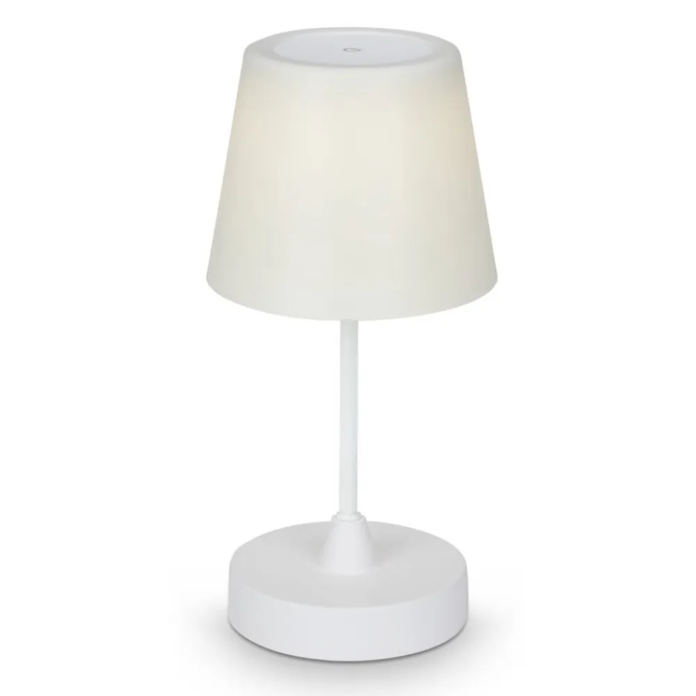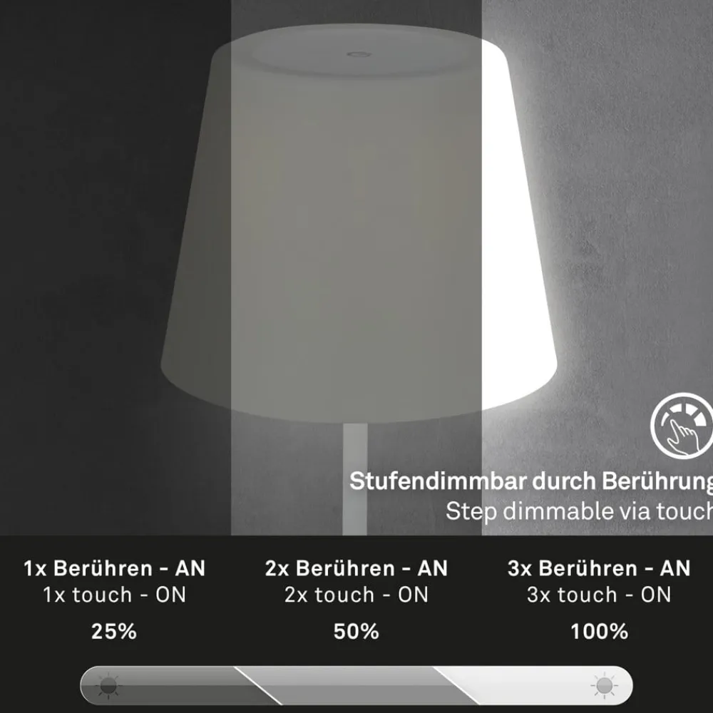 Lille Campi LED-bordlampe med genopladeligt batteri til udendørs brug Campi LED-bordlampen, som er beskyttet mod vandsprøjt (IP44), er en stemningsfuld, universalhvid lyskilde på terrassen, til havefesten eller på rejsen. Den er udstyret med et genopladeligt batteri og leveres med et USB-kabel til opladning. Touch-kontrolfladen på toppen af den hvide skærm gør det muligt at skifte og dæmpe i tre lysstyrkeniveauer (100 %, 50 %, 25 %).