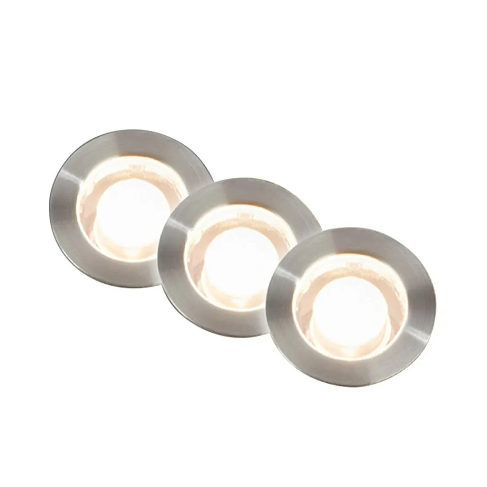 Startersæt til 12 V udendørsbelysning – tre runde LED-indbygningsspots Ø 3 cm i rustfrit stål med stiknetdel