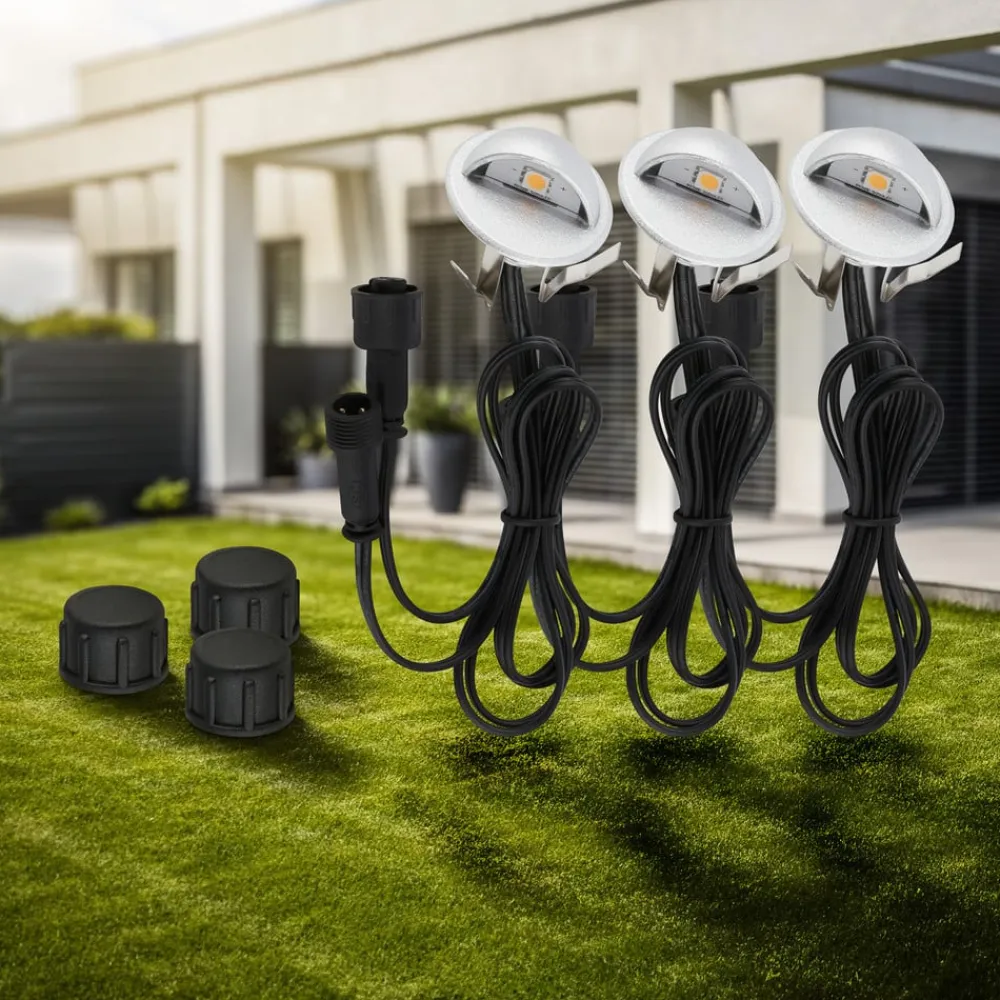 Udvidelsessæt til 12 V udendørslampe – tre runde LED-indbygningsspots Ø 3,5 cm i rustfrit stål Dette sæt med tre varmhvide LED-indbygningsspots bruges til at udvide 12 V udendørslampen fra Briloner. Lyset udsendes fra siden, så den tilstødende sti eller facade kan blive oplyst. De runde spots er udstyret med et hus i rustfrit stål og et plastdæksel og har passende tilslutningskabler med stikforbindelser til 12 V-systemet. En udendørs plug-in-transformer til 230 V-tilslutning til stikkontakten er ikke inkluderet – der kræves et startsæt (se tilbehør) – Udvidelsessæt med tre lys og 12 V-tilslutningskabler – Eksklusiv plug-in-transformer – Kapslingsgrad: IP65