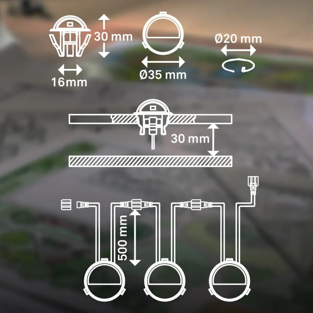 - tre indbygningslamper (12 V) med indgangskabel (12 V) og udgangskabel (12 V)