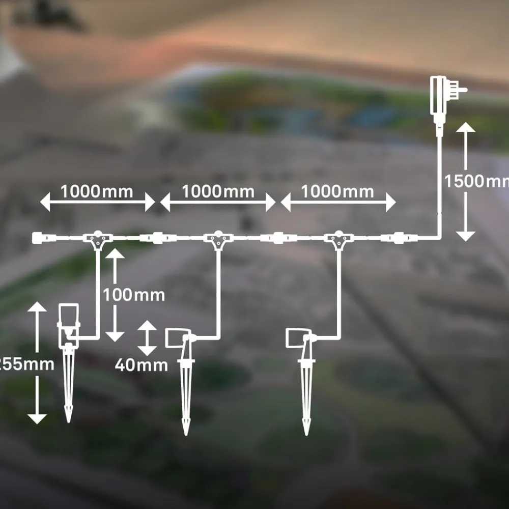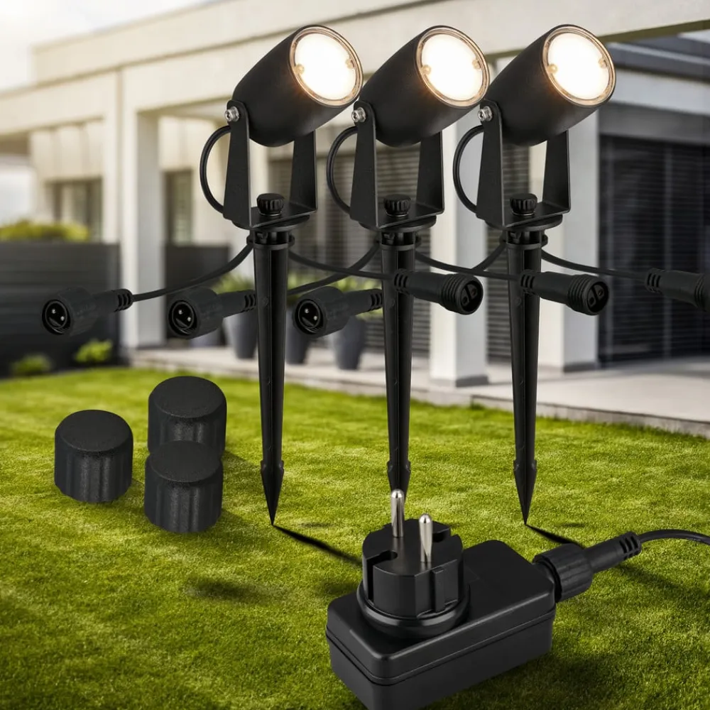 - tre lamper med jordspyd (12 V) med indgangskabel (12 V) og udgangskabel (12 V), en udendørs plug-in-strømforsyningsenhed (230 V) med udgangskabel (12 V)