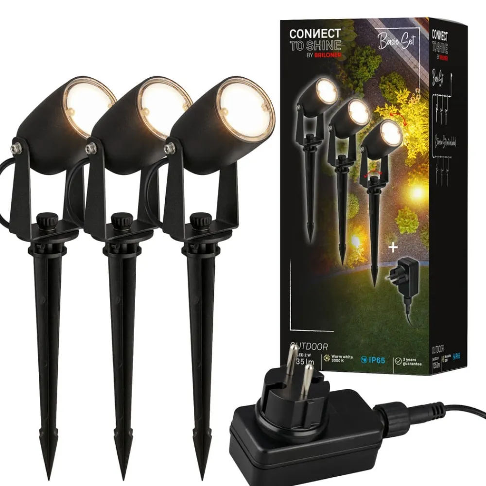 Startsæt til 12 V udendørslampe – tre drejelige LED-spot med jordspyd Ø 4 cm med plug-in strømforsyning Dette sæt med tre varmhvide LED-spot med jordspyd er et komplet sæt til 12 V udendørslampen fra Briloner. De runde spots er drejeligt monteret i rammen; sidstnævnte kan nemt forankres i asfalterede overflader ved hjælp af jordspyddet. Der medfølger en udendørs plug-in-transformer til 230 V-tilslutning til stikkontakten. Spotlightsene har passende tilslutningskabler med stikforbindelser til 12 V-systemet. Yderligere komponenter (se tilbehør) eller lygter fra 12 V-systemet kan tilføjes efter behov – Komplet sæt med tre lygter, 12 V-tilslutningskabler og 230 V til 12 V IP44-stikforsyning (maks. 15 W) – Kapslingsgrad: IP65