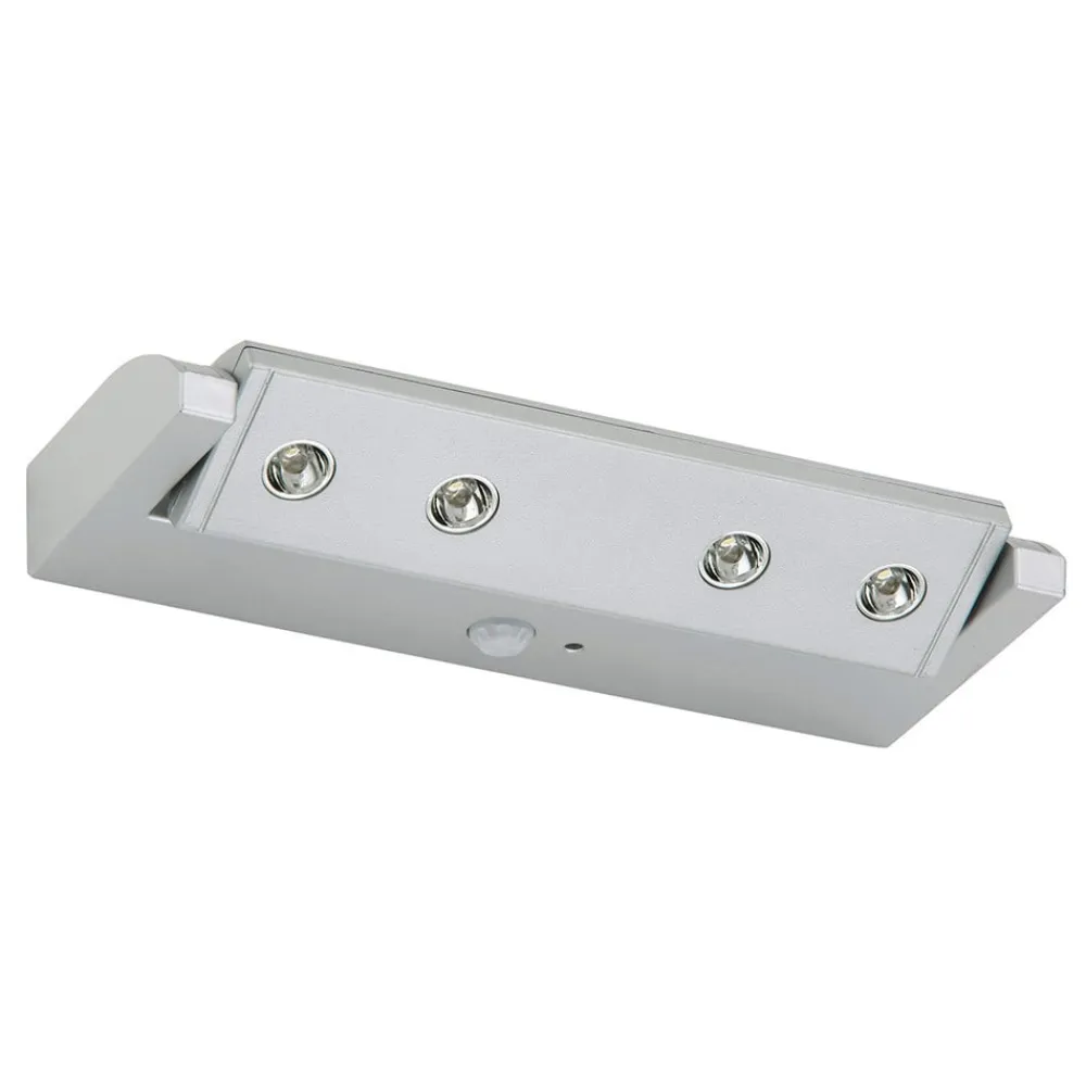 Lero – den drejelige, batteridrevne LED-underskabslampe Den enkle, fireflammede LED-underskabslampe Lero er ideel til kortvarig belysning i mørke. Den indbyggede lys/mørke-sensor skelner automatisk mellem, om der er brug for lys eller ej, baseret på de fremherskende lysforhold. Den integrerede bevægelsesdetektor registrerer personer og tænder lyset i et halvt minut, når der registreres bevægelse. Inden for en rækkevidde på tre meter registrerer Lero alle bevægelser i en vinkel på 80° til 100°. Underskabsarmaturet Lero kan drives med batterier eller ved hjælp af en netadapter. LED’erne er allerede fast installeret ved leveringen og udsender et neutralt hvidt lys. Grundlæggende er alle indretninger velegnede som brugssteder.