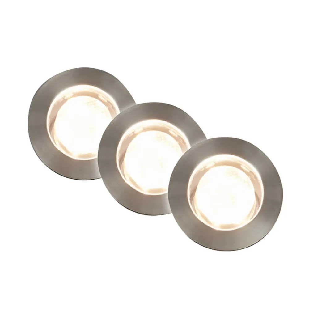 Startersæt til 12 V udendørsbelysning – tre runde LED-indbygningsspots Ø 4,5 cm i stål med stiknetdel