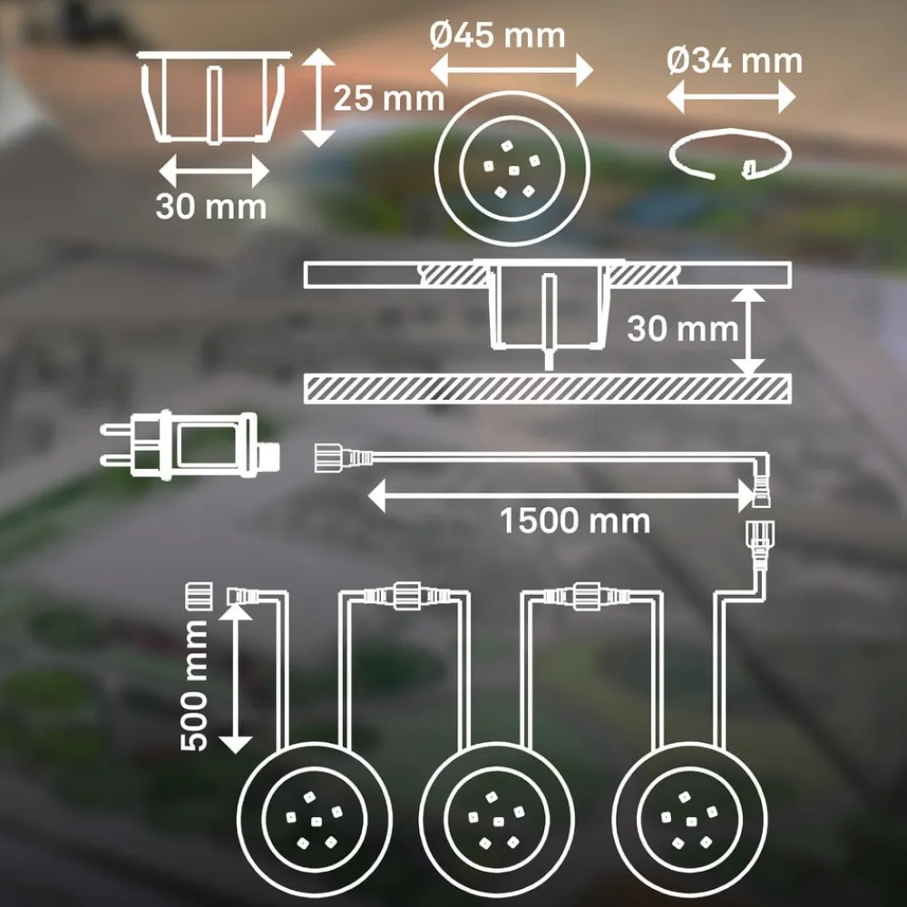 Dette sæt med tre varmhvide LED-indbygningsspots er et komplet sæt til Briloners 12 V udendørslampe-system. De runde spots har rustfrit stålhus og plastdæksel og leveres med passende tilslutningskabler med stik til 12 V-systemet. En udendørs stiknetforsyning til 230 V tilslutning til stikkontakten medfølger. Afhængigt af behovet kan yderligere komponenter (se tilbehør) eller lamper fra 12 V-systemet tilføjes.