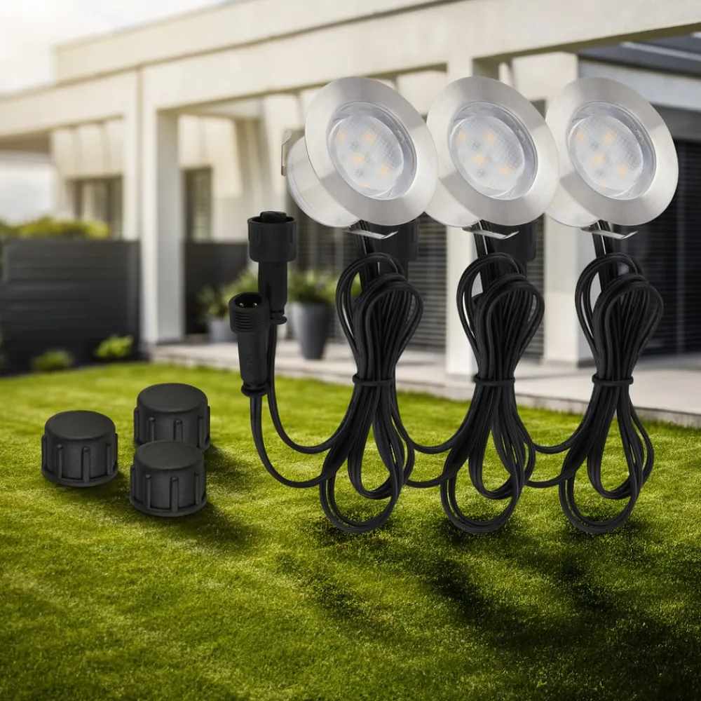 Udvidelsessæt til 12 V udendørsbelysning – tre runde LED-indbygningsspots Ø 4,5 cm i stål