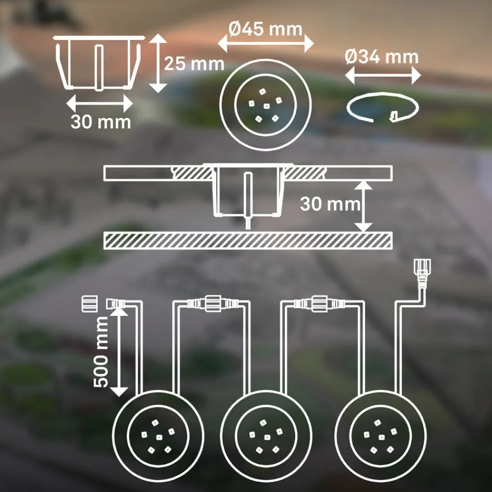 Dette sæt med tre varmhvide LED-indbygningsspots er til udvidelse af Briloners 12 V udendørslampe-system. De runde spots har rustfrit stålhus og plastdæksel og leveres med passende tilslutningskabler med stik til 12 V-systemet. En udendørs stiktransformator til 230 V-tilslutning til stikkontakten er ikke inkluderet – der kræves et startsæt (se tilbehør).