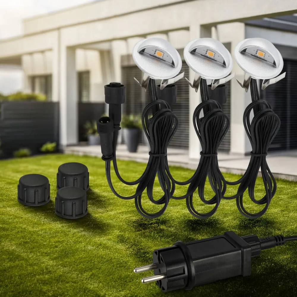 Startsæt til 12 V udendørslampe – tre runde LED-indbygningsspots Ø 3,5 cm i rustfrit stål med plug-in strømforsyning Dette sæt med tre varmhvide LED-indbygningsspots er et komplet sæt til 12 V udendørslampen fra Briloner. Lyset udsendes fra siden, så den tilstødende sti eller facade kan blive oplyst. De runde spots er udstyret med et hus i rustfrit stål og et plastdæksel og har passende tilslutningskabler med stikforbindelser til 12 V-systemet. En ekstern plug-in-transformer til 230 V-tilslutning til stikkontakten medfølger. Yderligere komponenter (se tilbehør) eller lamper fra 12 V-systemet kan tilføjes efter behov – Komplet sæt med tre lamper, 12 V-tilslutningskabler og 230 V til 12 V IP44 plug-in-strømforsyning (maks. 5 W) – Kapslingsgrad: IP65