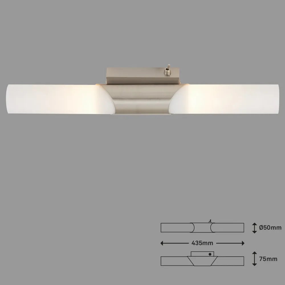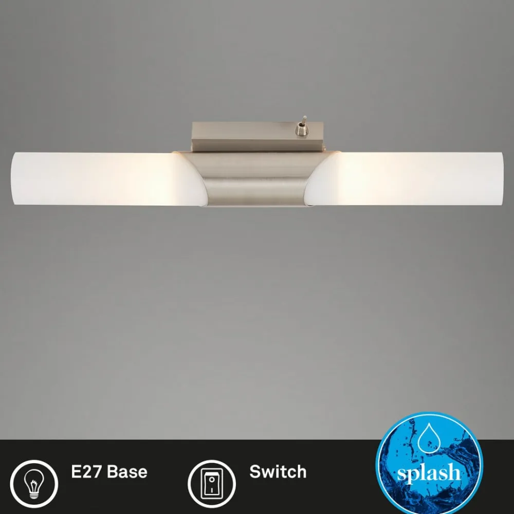 Splash væglampe til badeværelset med 2 lyskilder og vippekontakt Splash væglampen til badeværelset består af to matte hvide glasskærme, der giver en klar, blændfri belysning. Den matforniklede overflade giver en kontrast. Væglampen kan placeres ved siden af et spejl og give passende belysning på badeværelset. Væglampen til badeværelset er udstyret med to E14-fatninger, som sidder bag det rørformede glas, og en vippekontakt til ubesværet betjening på stedet.
