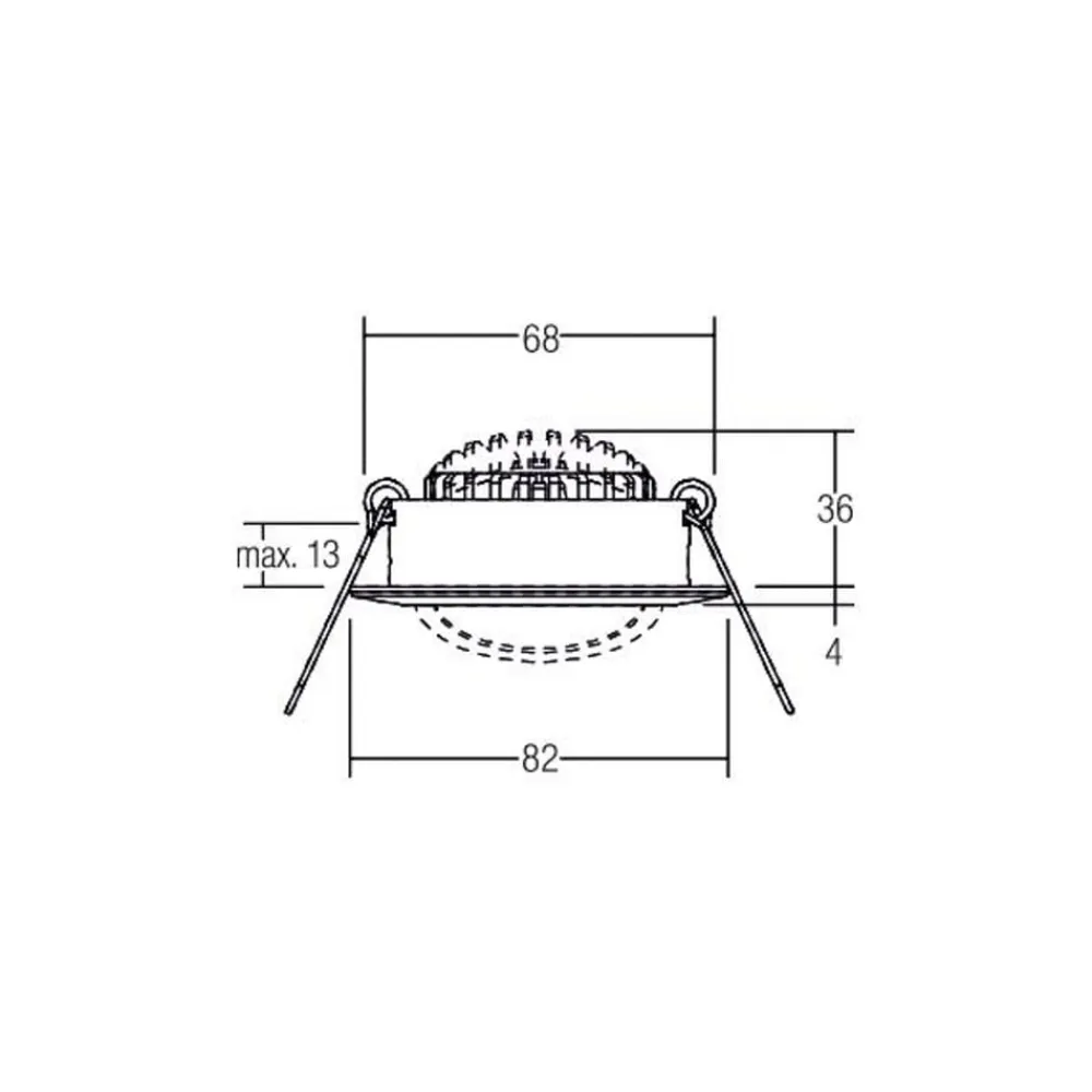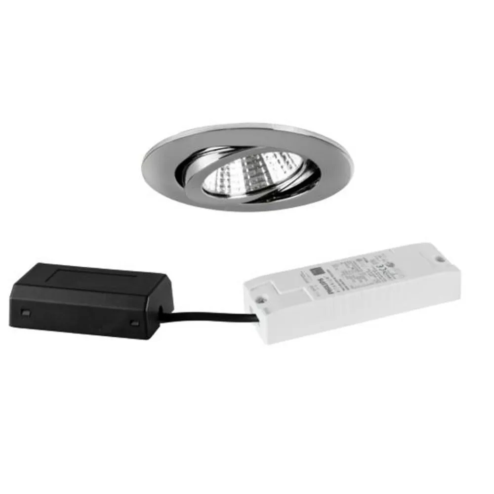 LED-indbygningsspot BB03 med DALI-dæmpbar driver og tilslutningsboks Dette runde LED-indbygningsspotsæt består af et spotlight med et armaturhoved, der kan vippes 30° i alle retninger, en DALI-dæmpbar LED-driver og en tilslutningsboks. Downlighten kan monteres uden værktøj ved hjælp af installationsfjedre. Den er udstyret med en sølvreflektor med dyb lysfordeling og en gennemsigtig polykarbonatafdækning – med elektronisk, DALI-2-dæmpbar forkobling – med tilslutningsboks – tilladt omgivelsestemperatur -20 til 25 °C – udstrålingsvinkel 38° – maks. lofttykkelse 1,3 cm – ingen afdækning med varmeisolerende materiale