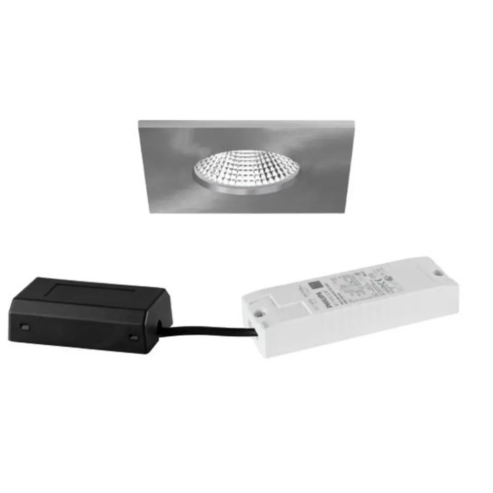 LED-indbygningsdownlight BB21 med DALI-dæmpbar LED-driver og tilslutningsboks, IP65 LED-indbygningsdownlighten BB21 leveres med en DALI-dæmpbar LED-driver og en 5-polet tilslutningsboks til gennemfortrådning. Med IP65-støvbeskyttelse og beskyttelse mod vandstråler er den perfekt til belysning af wellness-områder eller andre fugtige områder i den kommercielle sektor. Det varmhvide lys fra de indbyggede LED’er udsendes med en strålevinkel på 36° og afgives optimalt af den sølvfarvede reflektor med rotationssymmetrisk, dybtgående lysfordeling og transparent plastafdækning. Downlighten er udstyret med monteringsfjedre, så den kan installeres uden værktøj. Den egner sig til lofter med en tykkelse på op til 1,7 cm – leveres med elektronisk styring, DALI-2-dæmpbar – egnet til gennemfortrådning – tilladt omgivelsestemperatur – 20 til 25 °C – må ikke dækkes med varmeisolerende materiale – høj beskyttelsesgrad IP65