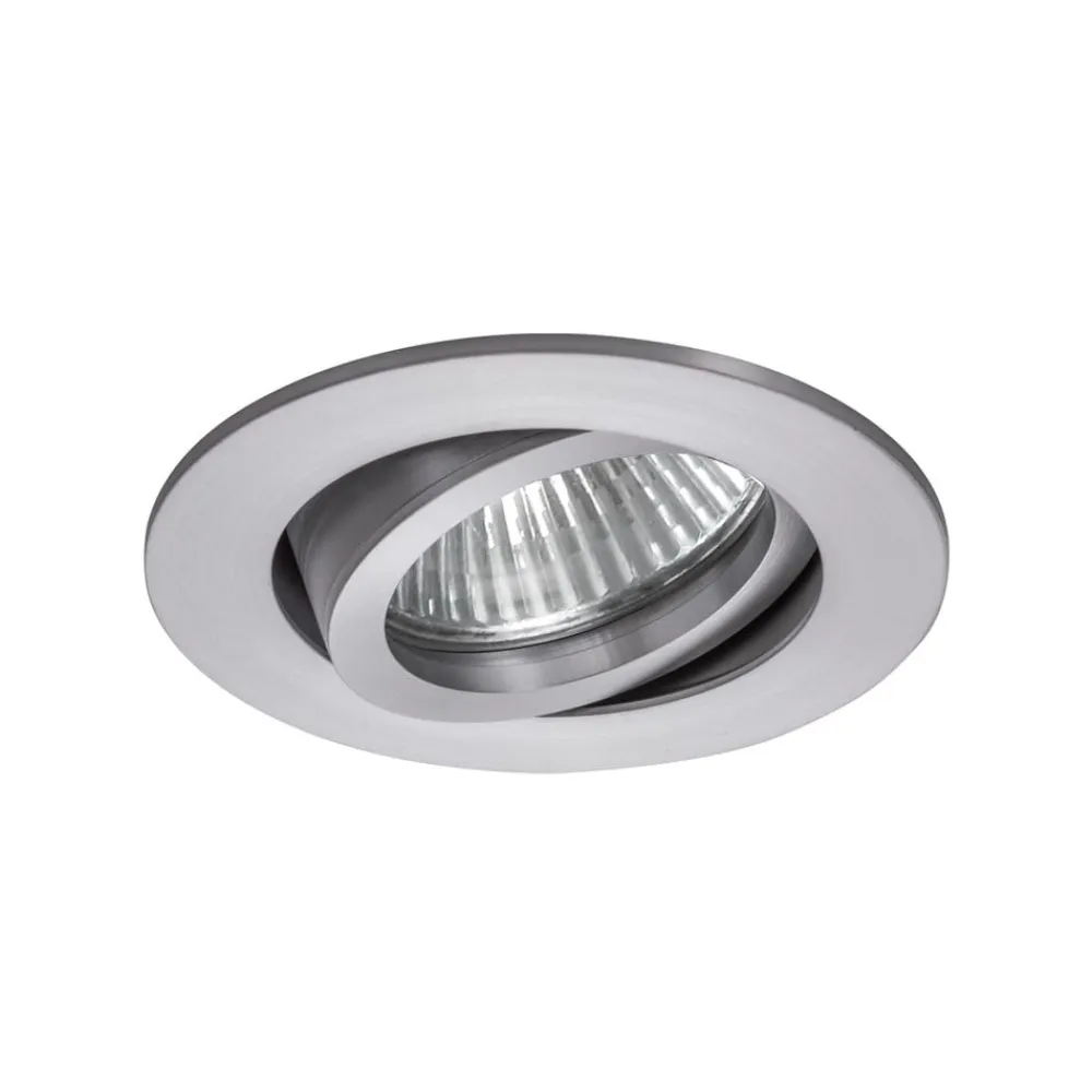 Indbygningsspot Tirrel-R med GU10-fatning Det runde LED-indbygningsspot Tirrel-R er lavet af massivt aluminium og udstyret med en GU10-fatning til montering af en lyskilde efter eget valg. Spotlightet har et klassisk, underspillet design og kan drejes 20° for at rette lyskeglen; det kan monteres uden værktøj ved hjælp af monteringsfjedre og er udstyret med et beslag til standardkonform trækaflastning – Husmateriale: aluminium – Beskyttelsesklasse (EN 61140): II, kapslingsgrad (DIN EN 60529): IP20 – Drejeområde 20° – Uden synlig snapring