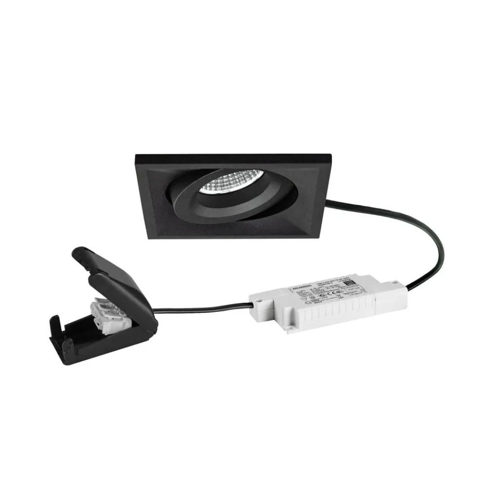 Indbygget LED-spot BB37 med LED-driver, dæmpbar bagkant og tilslutningsboks Det indbyggede LED-spot BB37 med firkantet ramme leveres som et sæt med en dæmpbar LED-driver til bagkant og en tilslutningsboks. Den kan drejes 20° for at rette lyset, og den kan monteres i loftet uden værktøj ved hjælp af monteringsfjedre. Den sølvfarvede reflektor med rotationssymmetrisk smal- og bredstrålende lysfordeling og den transparente polykarbonatafdækning sikrer højt lysudbytte og optimal lysfordeling – inkl. elektronisk forkobling, bagkantdæmpbar – inkl. tilslutningsboks, 3-polet til gennemfortrådning – tilladt omgivelsestemperatur (ta): -20 °C – +25 °C – spot kan drejes 20° hele vejen rundt – maksimal loftstykkelse 1,5 cm