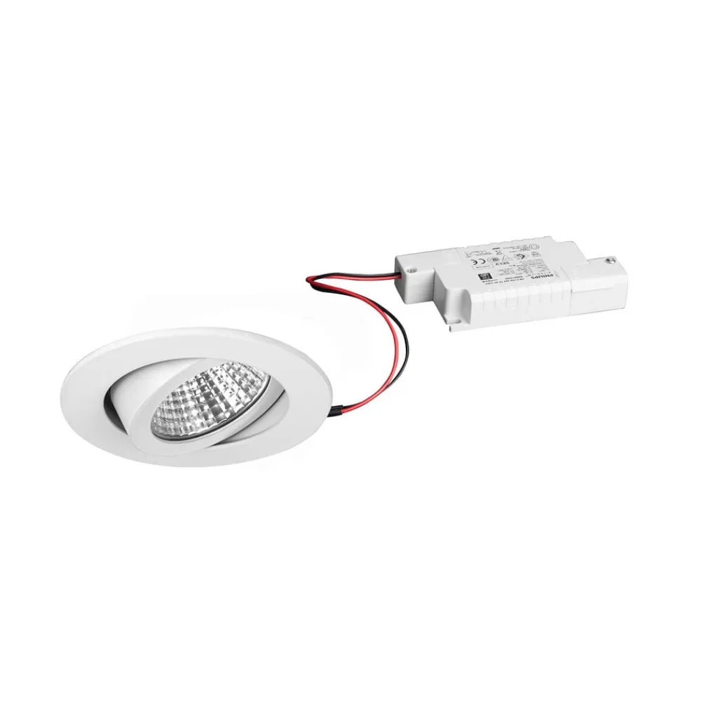 Udvendigt dæmpbar LED-indbygningsdownlight IP65 i rund form IP65-indbygningsarmaturet, som er beskyttet mod vandstråler, er en alsidig lyskilde til både offentlige og private indendørsarealer, hvad enten det er spisestuen på et hotel, omklædningsrummet i en swimmingpool eller badeværelset. Lysstyrken og retningen af lyset kan justeres efter behov. Der kræves intet værktøj for at fastgøre den i loftsudskæringen takket være de medfølgende monteringsfjedre – Inklusive LED-konverter; eksternt dæmpbar via faseafbrydelse – Udstrålingsvinkel: 38° – Drejeområde: 30° hele vejen rundt – Loftstykkelse: maks. 2,4 cm