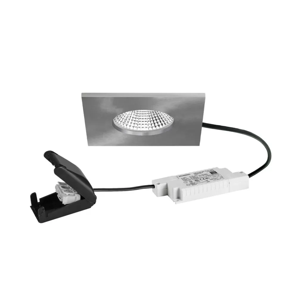 LED-indbygningsdownlight BB21 med LED-driver, dæmpbar bagkant og tilslutningsboks LED-downlighten BB21 er perfekt til wellnessområder, badeværelser og mange andre fugtige rum i private eller kommercielle områder. Den leveres komplet med LED-driver og tilslutningsboks og giver varmhvid belysning, som udsendes gennem den sølvfarvede reflektor med rotationssymmetrisk dybstrålende lysfordeling gennem det gennemsigtige plastdæksel i en vinkel på 36°. Med IP65-beskyttelse er den indbyggede downlight støvtæt og beskyttet mod vandstråler og kan også installeres i brusere osv. Den kan monteres uden værktøj ved hjælp af monteringsfjedre og kan installeres i lofter med en tykkelse på op til 1,7 cm – inklusive elektronisk forkobling, bagkantsdæmpbar (RC) – med tilslutningsboks, 3-polet til gennemfortrådning – tilladt omgivelsestemperatur – 20 til 25 °C – må ikke dækkes med varmeisolerende materiale – høj beskyttelsesgrad IP65