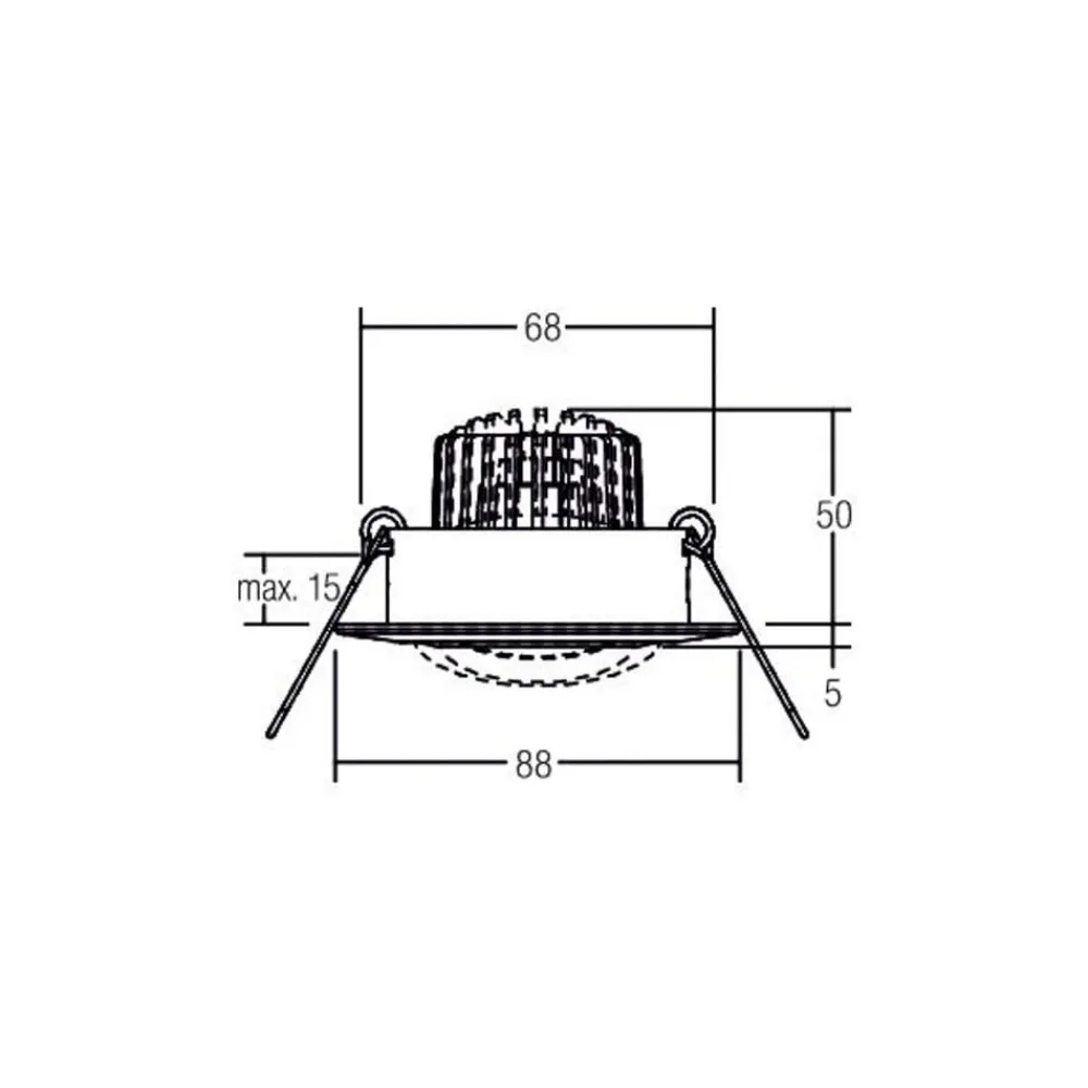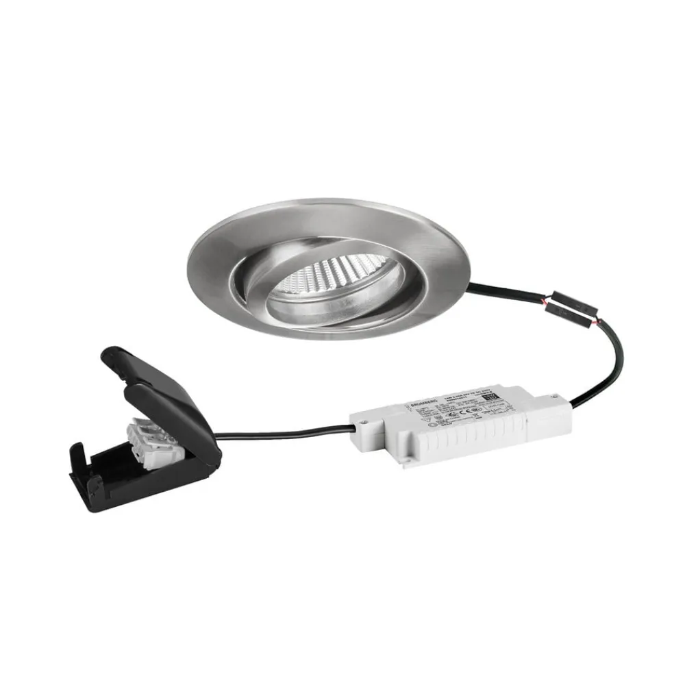 BB13 rundt LED-indbygningsspotsæt med bagkantsdæmpbar driver (RC) og tilslutningsboks BB13 LED-indbygningsspotsættet består af et rundt LED-indbygningsspot, en LED-driver, der kan dæmpes med en bagkantsdæmper (RC), og en tilslutningsboks. Den runde downlight udsender varmt hvidt lys i en vinkel på 38°. Lyskeglen kan rettes i den ønskede retning ved at dreje spotlightet 25°. Hvis downlightet dæmpes med en ekstern bagkantsfasedæmper, skifter lysfarven takket være dim-2-warm-funktionen. Mens der ved fuld lysstyrke udsendes varmhvidt lys med en farvetemperatur på 3.000 K, reduceres farvetemperaturen ved det laveste dæmpningsniveau under dæmpningsprocessen til 1.800 K. – inkl. elektronisk forkobling, bagkantfasestyring (RC) dæmpbar – dim2warm-funktion – inkl. tilslutningsboks – sølvreflektor med rotationssymmetrisk dybstrålende lysfordeling – transparent glasafdækning – ingen afdækning med varmeisolerende materiale – maks. lofttykkelse 15 mm
