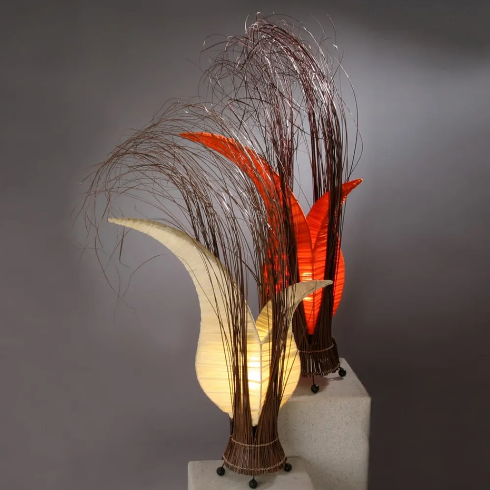 Bunga bordlampe med stofbeklædt blomst i creme Bunga bordlampen har et usædvanligt og naturligt udseende med en tulipanlignende, stofbeklædt blomst omgivet af sivgrene. Bunga-bordlampen spotlighter stemningsfuldt og er yderst dekorativ, selv når den er slukket. Leveres med en afbryder i det 2 m lange forsyningskabel.