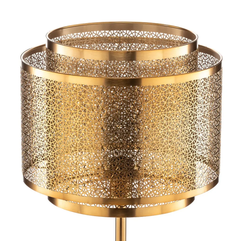 Gulvlampen Hermine er fremstillet af metal med en mat messingfinish. Den giver betragteren en orientalsk stemning og skaber en behagelig lysstemning. Lampeskærmen består af to cylindre af forskellig højde og diameter, der er sat ind i hinanden. Begge elementer er designet med et stjerneformet hulmønster, der får lyset til at stråle særligt effektfuldt ud i rummet. Lampeskærmen bæres af en enkel stangkonstruktion på en rund lampefod. En E27-fatning giver plads til pærer efter eget valg.