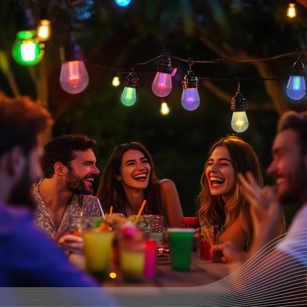 Vibey LED-lyskæde med CCT og RGBIC-farvestyring, 10 lyskilder, 10 meter Oplev, hvordan Vibey LED-lyskæden forvandler udendørsarealer til en oase af velvære. LED-teknologien sikrer en effektiv og langtidsholdbar belysning, der fremhæver enhver lejlighed. Farvetemperaturen (CCT) og det dynamiske farvede lys (RGBIC) kan indstilles ved hjælp af den medfølgende fjernbetjening. Takket være et 5 meter langt tilslutningskabel med stik forbliver Vibey dynamisk, ikke kun når det gælder belysning. Tekniske egenskaber – med fjernbetjening (inkl. batteri) – justerbar farvetemperatur (CCT) fra varmhvidt lys (2.700 K) til dagslys-hvidt lys (6.500 K) – klar til brug med det samme takket være 5 meter langt tilslutningskabel og integreret driver