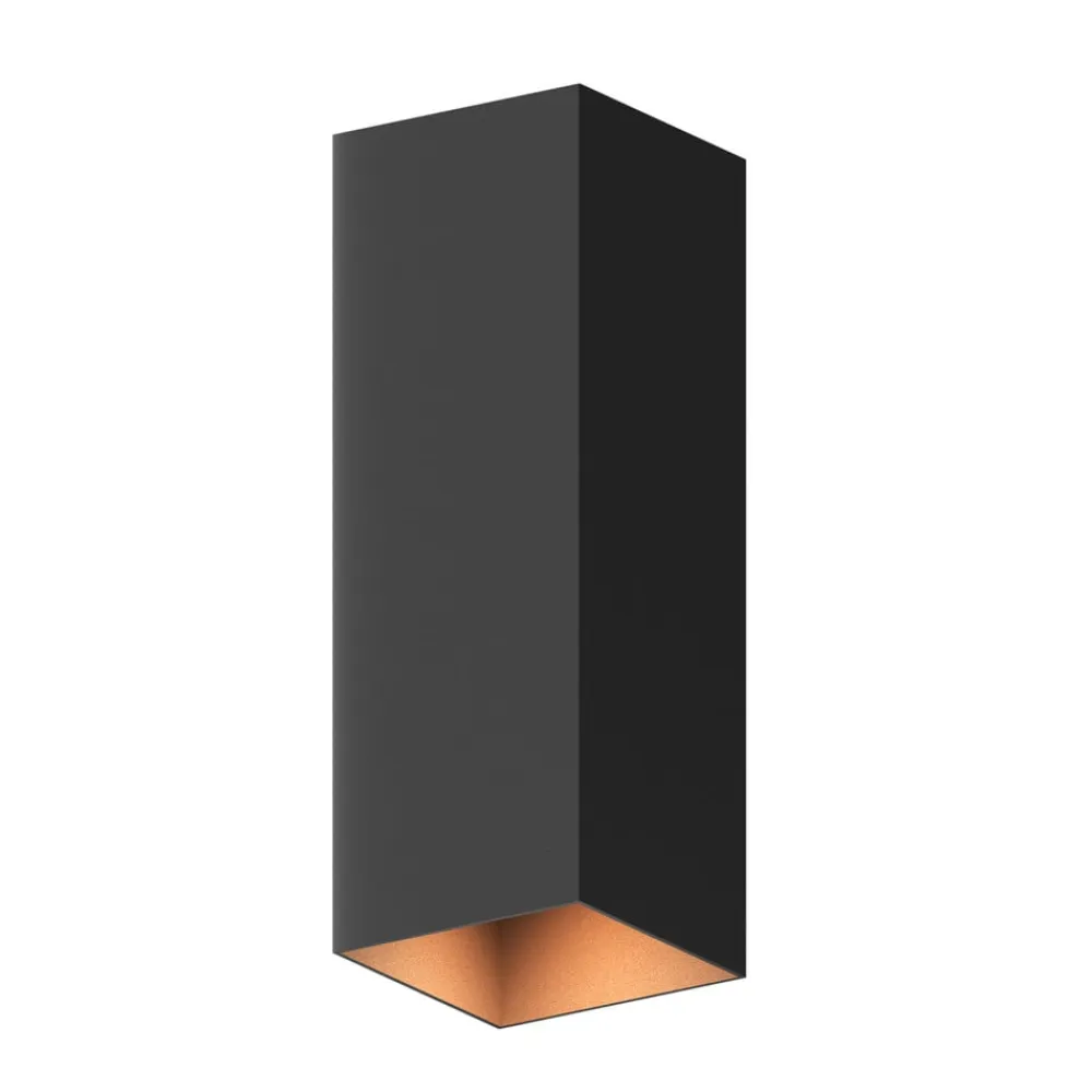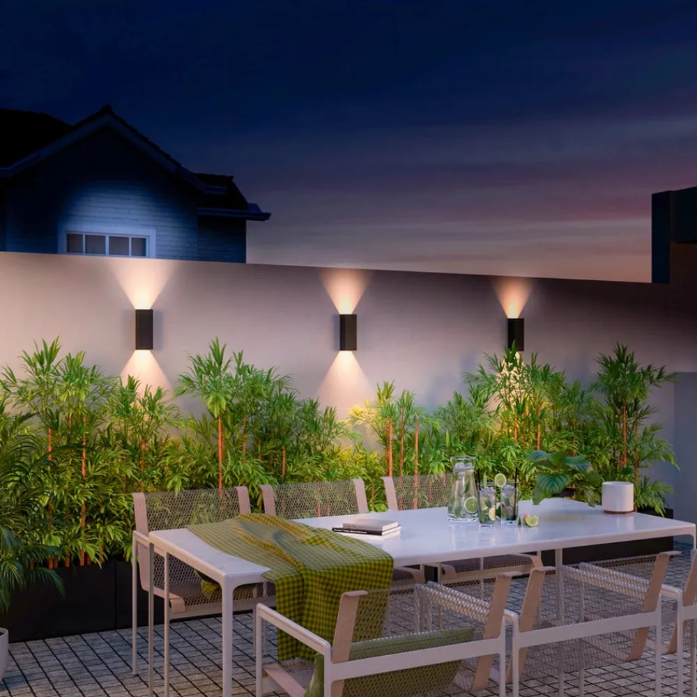 Rektangulær, kubisk udendørs LED-væglampe med glasdæksler, top- og bundfordeling Den rektangulære udendørs væglampe bruges til moderne accent- og orienteringsbelysning på facader og indgangspartier. Aluminiumshuset er designet i en enkel, høj kubisk form med en sort finish. Beskyttet bag glasdæksler er der integreret to varmhvide LED-lyskilder, som udsender lys opad og nedad – Beskyttelsesgrad: IP54 – Inkluderer LED-driver med konstant strøm (on/off)