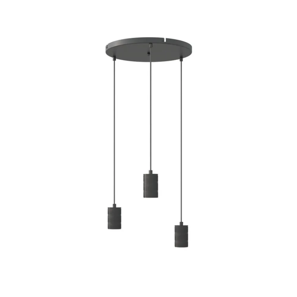 Rund vedhængslampe Retro lavet af metal, tre flammerTre fatninger lader sig falde ned fra den runde baldakin på vedhængslampen Retro. Den består af metal og er lakeret i én farve. Dens fatninger har et diskret stribet mønster og leveres hver med to valgfrie ringe, der gør det muligt at montere pærerne fladt. Da der er tale om åbne fatninger uden skærm, kan der anvendes særligt store pærer samt pærer med en særlig form. Passende E27-pærer kan findes i tilbehør.